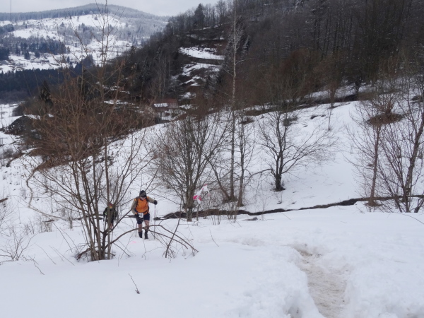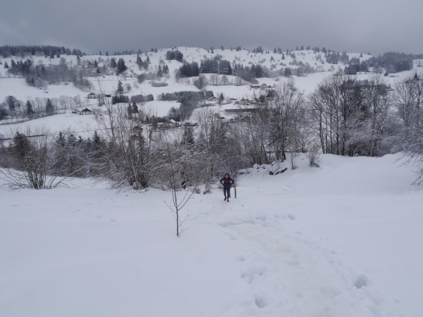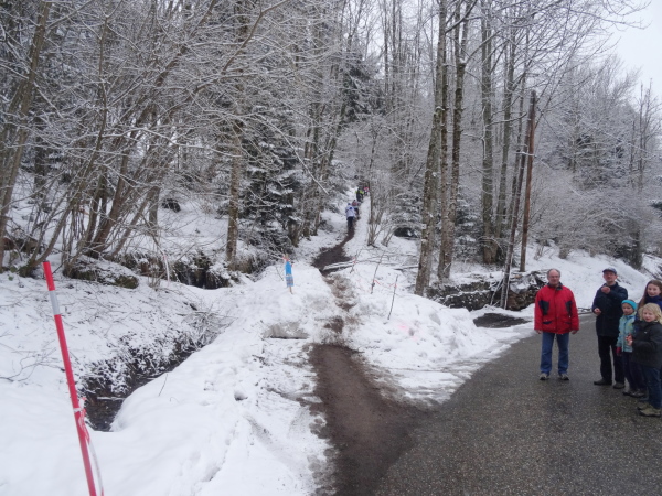 Jetzt steht der letzte und ultimative Aufstieg (wieder im Schnee) an. Auf ca. 2 Km müssen etwa 250 HM erklettert werden. Mal in kurzen Serpentinen, aber auch in direkter Linie geht es steil bergan. Nach etlichen Verschnaufpausen erreiche ich irgendwann den Scheitel. Unter mir liegt Cornimont im Sonnenschein und ich freue mich auf den Abstieg. „Arrivee 4 Km“ ist auf dem Hinweisschild zu lesen. Und das abwärts, an einem steilen Berghang. Der Schnee wird weniger und der Matsch mehr.