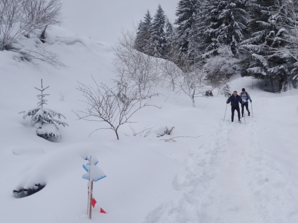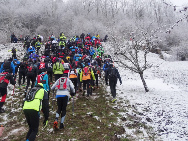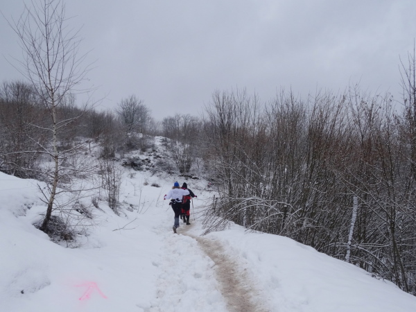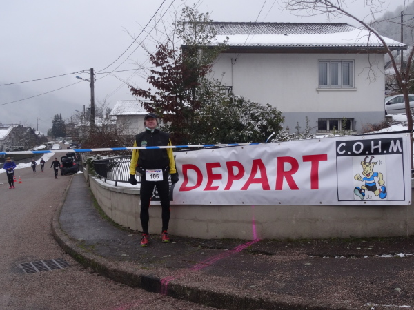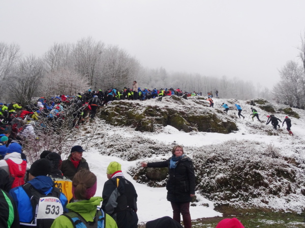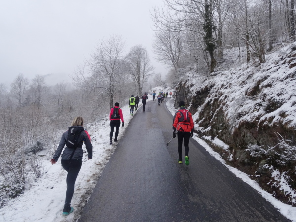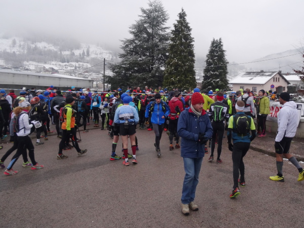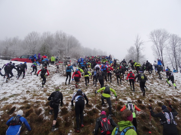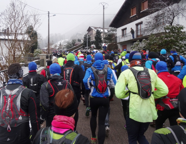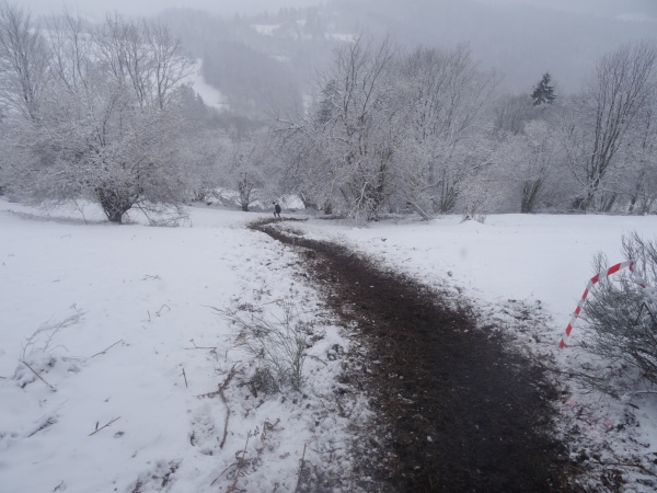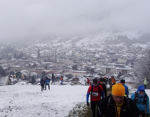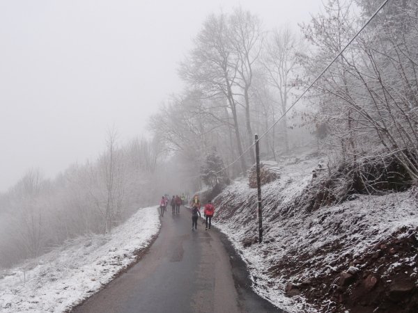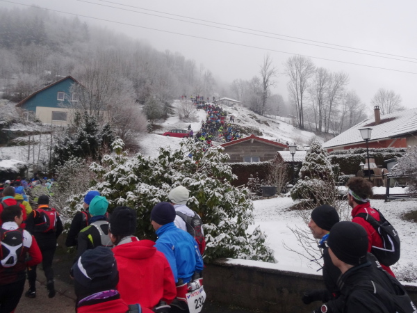 In der Nacht vor dem Start hat es in den höheren Lagen heftig geschneit. Nach erfolgtem Start windet sich eine bunte Läuferschlange durch die Straßen stetig bergan. Nach ein paar Serpentinen ist die Straße gesperrt und es muss zur nächst höher gelegenen Straße über eine steile und verschneite Wiese geklettert werden. Das geht gleich dreimal so. Oben angekommen, bietet sich mir ein schöner Blick zurück auf das verschneite Cornimont.