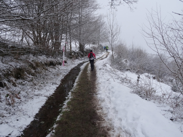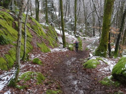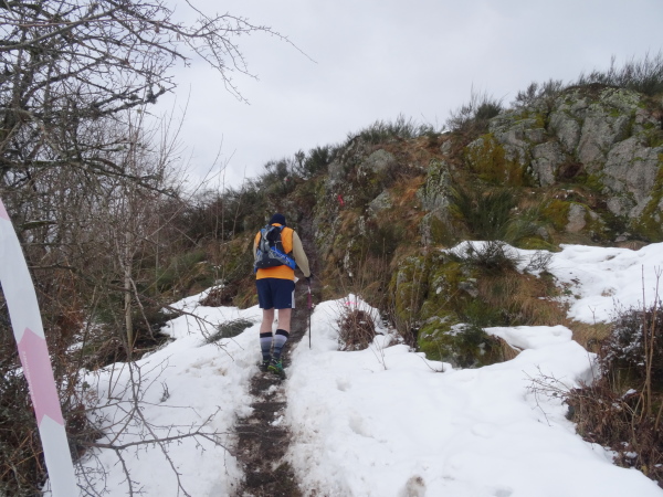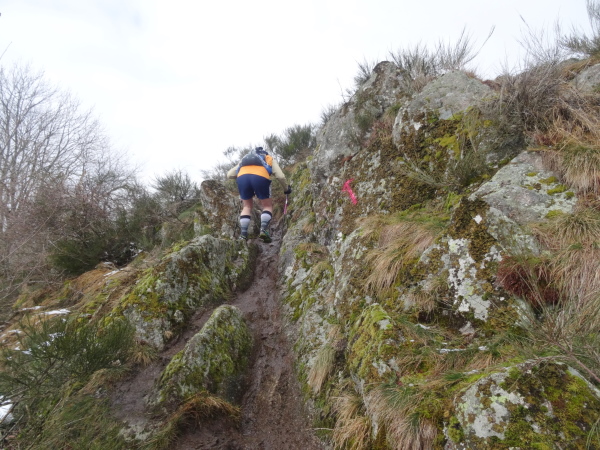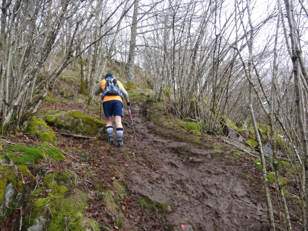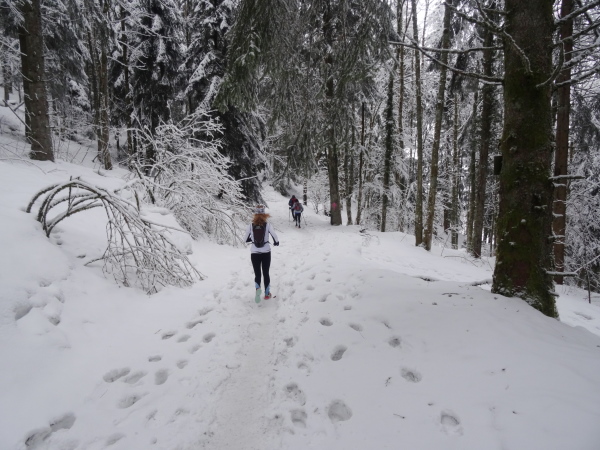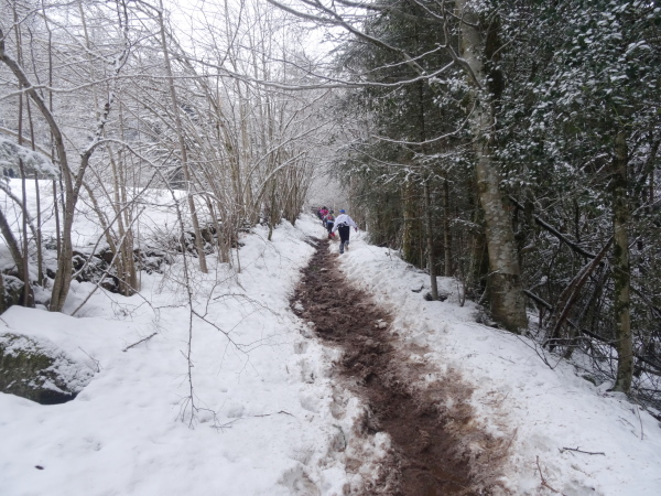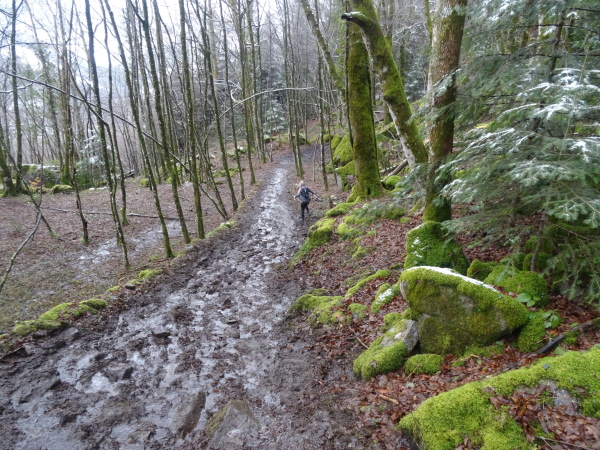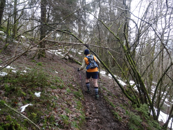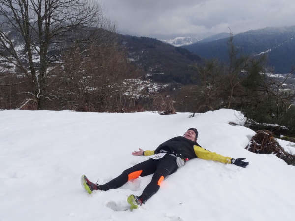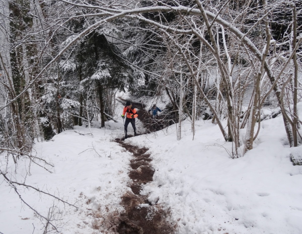 Auf den nächsten 3 Km ist dann ab einer Ferme wieder Kletterei angesagt. Im Matsch ist es abwärts einfacher als aufwärts. Da ich nicht mit Stöcken laufe (wie soll ich sonst Fotos machen), muss ich mich an Bäumen nach oben ziehen. Sogar mein Mitläufer hat als Pikadores Probleme an dieser Stelle. Nachdem wir endlich wieder Schnee unter unseren Laufschuhen haben, gönne ich mir auf einem Schneebrett eine Pause im Liegen.