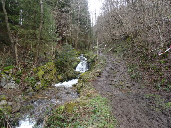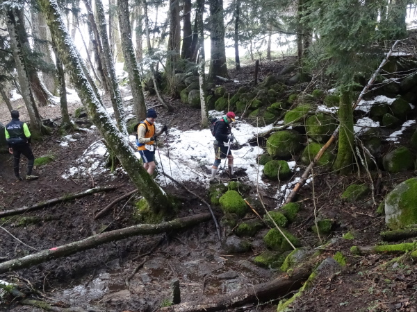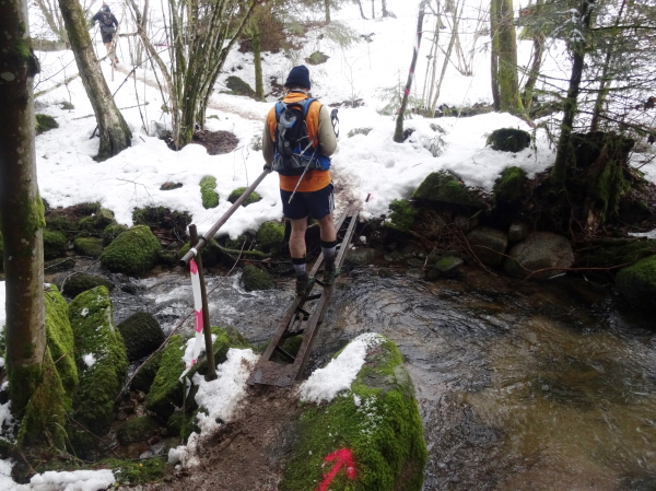 Immer felsiger und schmaler wird es im weiteren Verlauf des Trails. Nach Erreichen des Scheitelpunktes hieß es wieder absteigen. Auf einem Kilometer mit vielen Schlammpassagen gehen 110 HM verloren. Ein kleines Waldgebiet mit jeder Menge Bruchholz und tiefem Schlamm fordert einiges an Koordination. Einen kleinen Bach dürfen wir komfortabel auf einem Eisenträger queren.