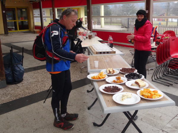 Später erzählt mir Marita, dass viele Trailer im Ziel aussahen wie im Matsch gebadete Schweine. Auch ich habe nicht nur im Schnee Bodenkontakt, sondern bleibe auch zweimal im Schlamm stecken. Immer wieder suchen wir neben dem Schlammpfad festen Untergrund. Am tiefsten Punkt in „Saulxures sur Moselotte“ auf 453 müNN am Campingplatz erreicht ich dann die einzige Versorgungsstelle.