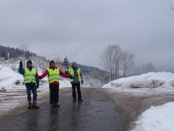 Am Samstag, den 21. Feb. machten Marita und ich uns auf die Socken. Unsere Anreise ging über Colmar und durch das Vallee de Munster. Leider zeigte sich das Tal absolut schneefrei. Dies sollte sich aber ändern, da es ab Munster nur noch berghoch zum Col de la Schlucht ging. Oben auf der Passhöhe tauchten wir dann in eine Wintermärchenlandschaft ein. Gott sei Dank ging es ab hier über La Bresse nach Cornimont nur noch abwärts. Dabei verbesserten sich die Straßenverhältnisse zusehends. Cornimont war dann fast wieder schneefrei.