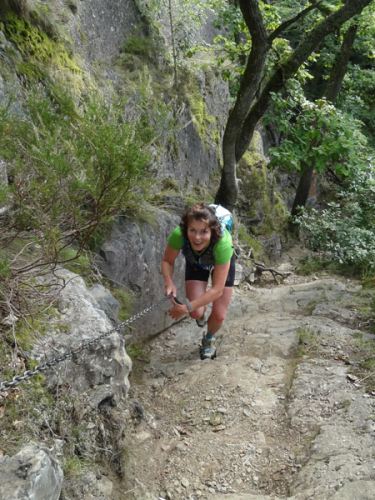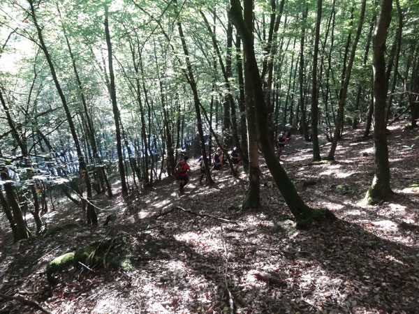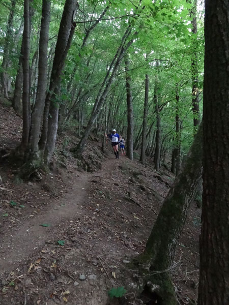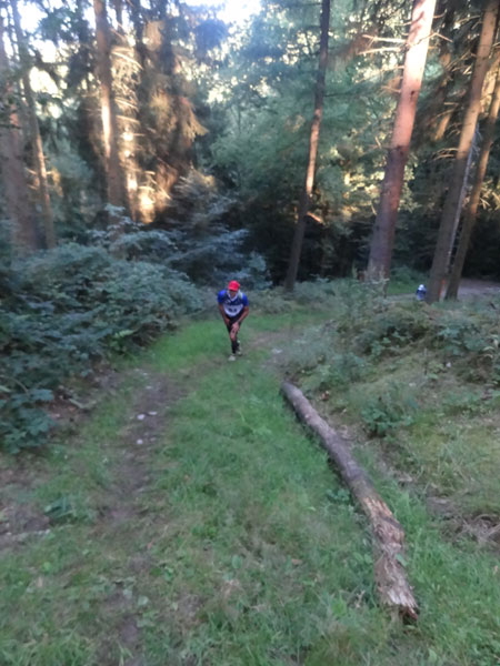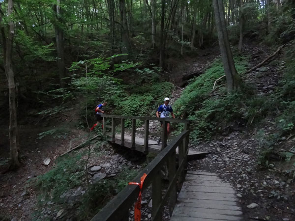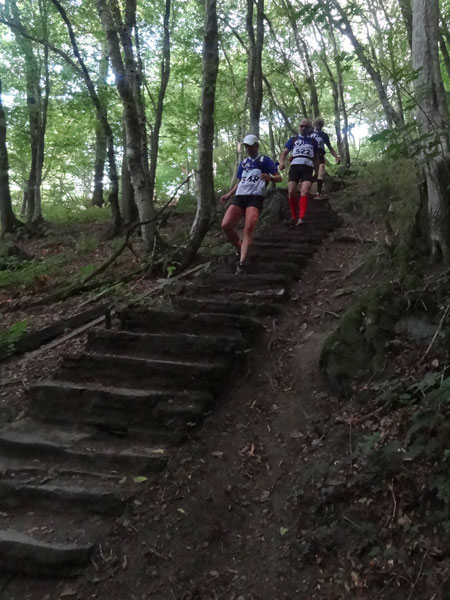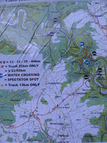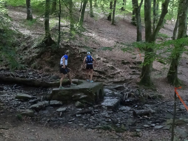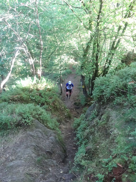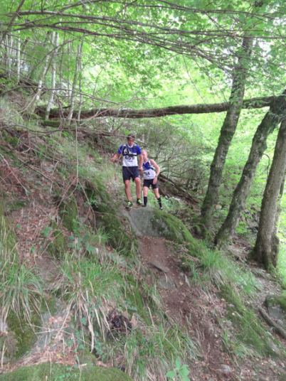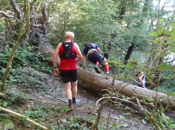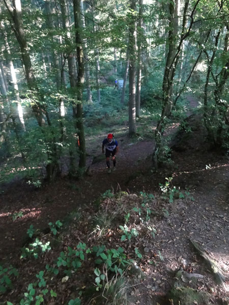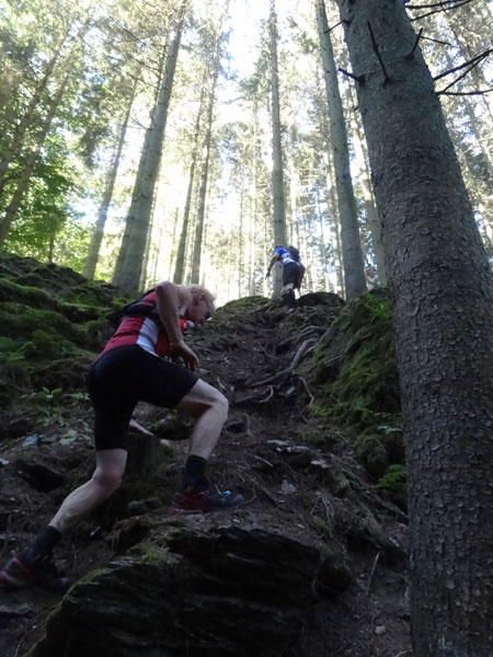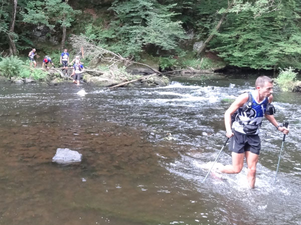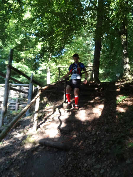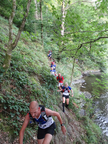 Nach Erreichen des Scheitels hoch über der „Ourthe“, bietet sich den Teilnehmern ein herrlicher Blick über die Wälder der Ardennen und hinunter ins Tal. So steil wie es hinauf ging, so steil geht es auch hinab zur „Ourthe“. Mal in Serpentinen und auch mal in direkter Linie auf dem Hintern. Hier benötigt man wirklich gute Traillaufschuhe mit besonders grobem Profil. Neben dem Fluss laufend besteht der schmale Pfad ausschließlich aus Wurzeln und Steinen der übelsten Sorte. Zwischenzeitlich taucht man sogar in einen Urwald ein, wo immer wieder unter querliegende Bäume gekrochen oder über die gesprungen werden muss. Ein Traum für jeden Geländeläufer.