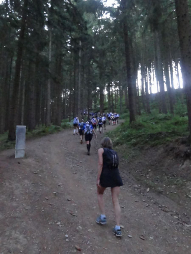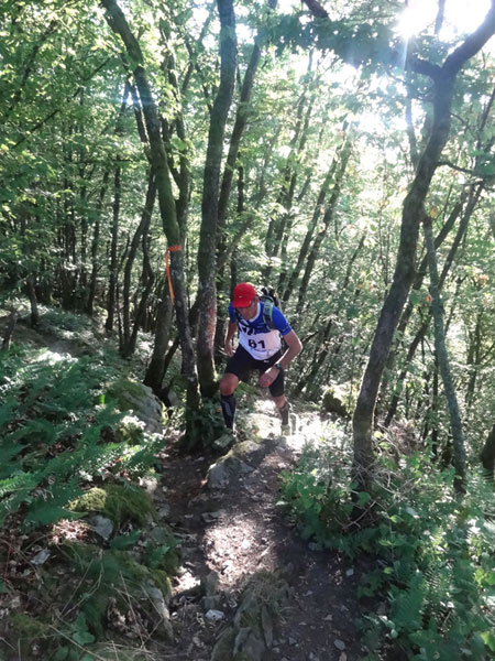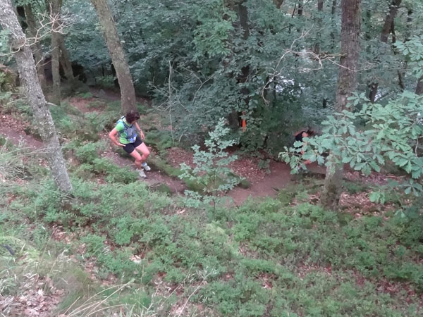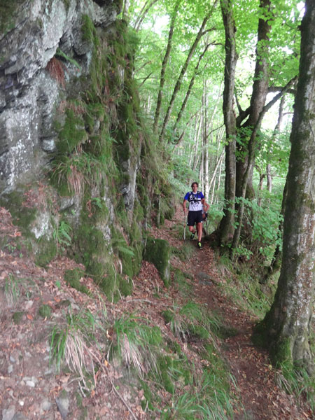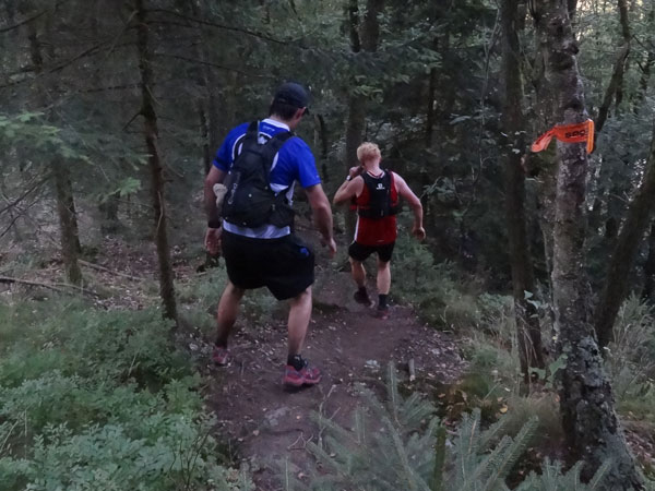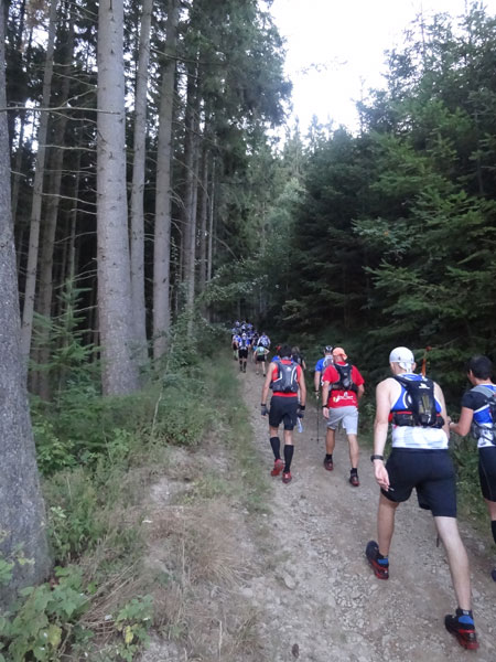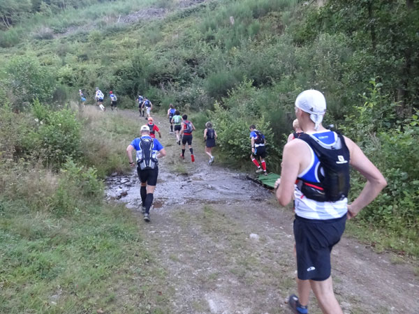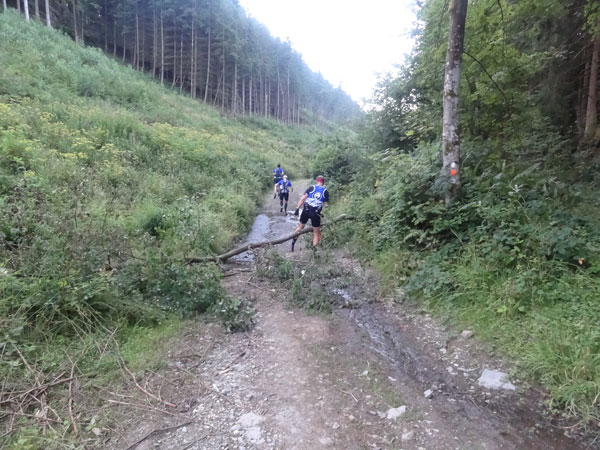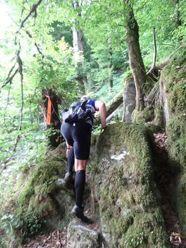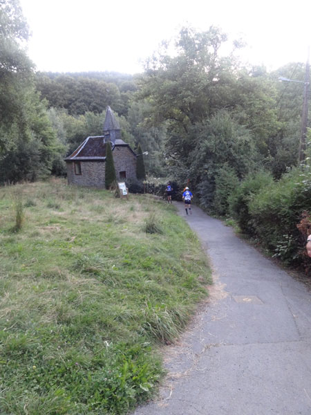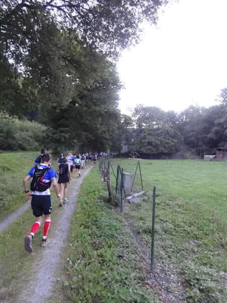 Um 7:00 Uhr gehen dann knapp 160 Teilnehmer auf eine abenteuerliche Reise. Zuerst geht es ein Stück durch den Ort bis an den Wald und dem ersten leichten Anstieg. Ein erster kleiner Bach muss bei km 2 übersprungen oder durchlaufen werden. Der folgende Anstieg ist dann etwas steiler und es wird direkt marschiert. Bei der „Chapelle Ste- Marguerite“ wird die Laufstrecke dann ruppiger. Erste Bäumchen, die über dem Weg liegen, müssen überklettert werden. Wenig später geht es dann zur Sache, denn der folgende Anstieg wird steiler im immer dichter werdenden Wald. Immer schmaler wird der Pfad und immer mehr Wurzeln erschweren den Lauf. Mittlerweile müssen auch die ersten Felspassagen erklettert werden.