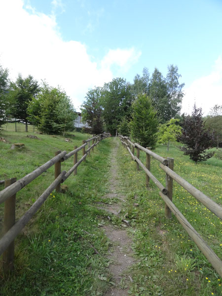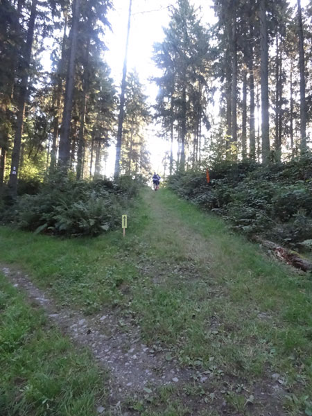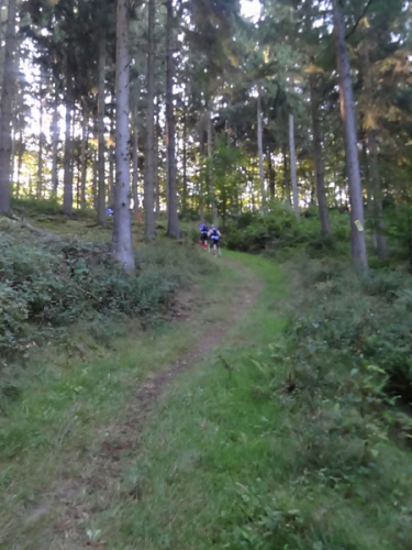 Kurz neben dem Fluss laufend zeigt der Pfad schon wieder nach oben, diesmal erfolgt der Aufstieg aber auf einen breiten Forstweg in Serpentinen. Auch hier wird mittlerweile viel und lange gewandert. Fast oben angekommen, durchläuft man eine kleine Bungalow Ferienhaussiedlung. Ein Stück geht es auf den Ardennenhöhen durch den Wald flach daher. Nach dieser Erholungsphase geht es auf schmalen Pfaden bergab zur vierten und letzten VS bei Km 44.