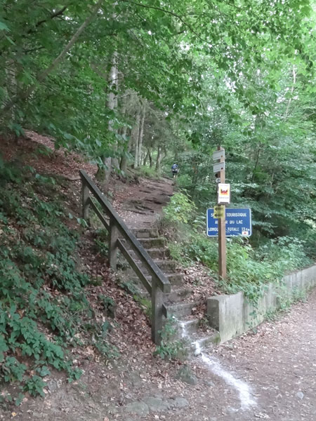 Da will ich auch hin, aber der Weg ist noch weit. Fast nur flach geht es daher, aber kleine kurze An- und Abstiege, teils über Wurzeln und Steine ziehen einem kontinuierlich die Kraft aus den Beinen. Ist die Umrundung geschafft, geht es hoch durch einen Bruchwald aus umgestürzten Tannen auf ein Hochplateau. Hier läuft man auf einem Feldweg zur dritten VS bei Km 34.