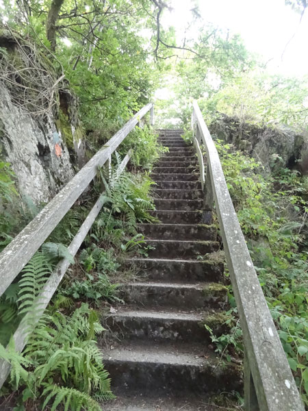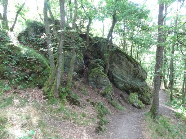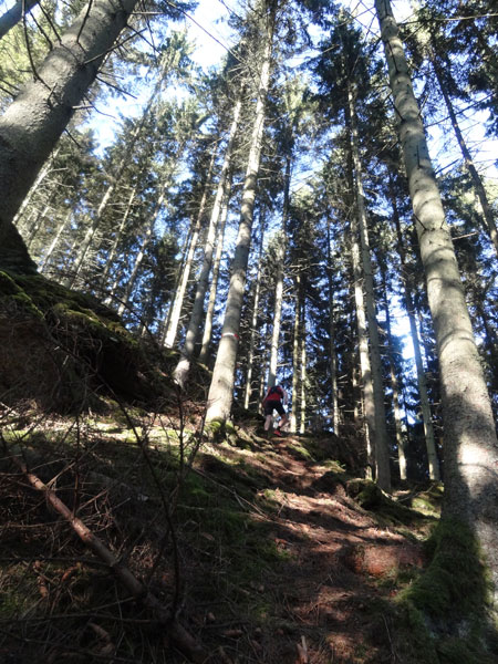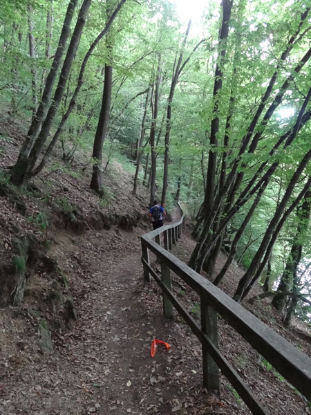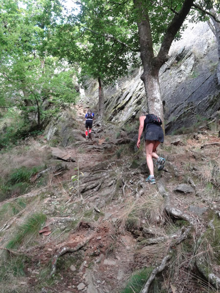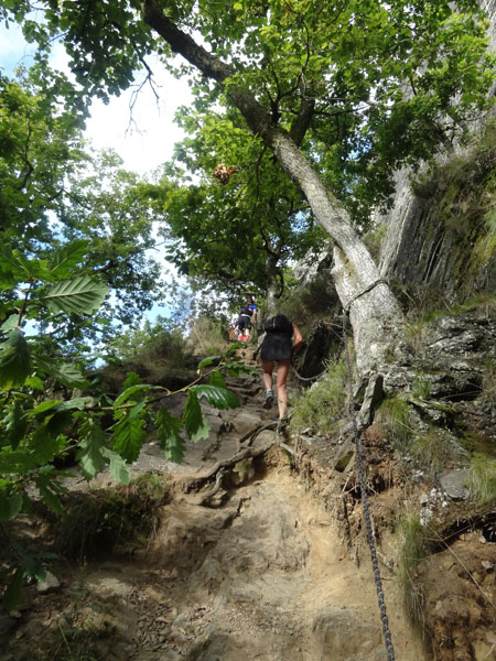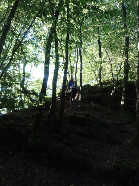 Ist dieser Streckenabschnitt geschafft, zeigt die Laufrichtung sogleich in Richtung Himmel, den man fast nicht sieht, denn der Wald in dem wir uns befinden, ist ziemlich dicht gewachsen. Dieses Mal müssen etliche Höhenmeter über Stufen erklommen werden. Ist der höchste Punkt dieser Passage erreicht, geht es auf einem schmalen Grat einige hundert Meter daher. Links und rechts nur steiler Abgrund. Der folgende steile Abstieg erfolgt dann wie der Aufstieg über Treppen hinunter zur „Ourthe“.