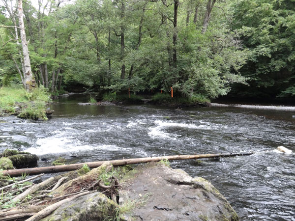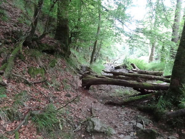 Wieder unten am Fluss angekommen, wird es spektakulär, denn der Pfad endet plötzlich im Nichts. Bin ich falsch oder muss ich gar durch den Fluss. Angebrachte Markierungsbänder am gegenüberliegenden Ufer sprechen eine eindeutige Sprache. Kein Seil oder sonst eine Hilfe ist für diese Flussquerung angebracht. Da der Grund des Flussbettes aus Steinen unterschiedlicher Größe besteht, ist die erfrischende Durchquerung der „Ourthe“ kein leichtes Unterfangen. Drüben angekommen, geht es dann etliche Kilometer neben dem Fluss auf unebenem Geläuf entlang. Dabei müssen stellenweise Bäume und Felsen überklettert werden.