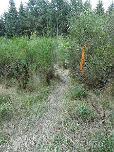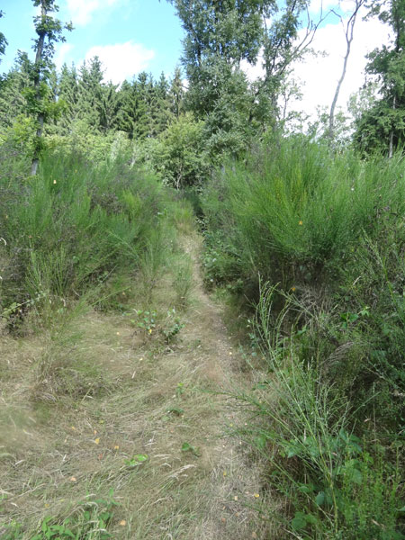 Nach dieser VS geht es eine Weile auf einer Forststraße durch den Ardennenwald. Hier zeigt ein Richtungspfeil plötzlich auf einen Singletrail durch hohes Ginstergebüsch. Es geht leicht abwärts. Ein kleiner Bach muss gequert werden, an dem ich mich ausgiebig erfrische. Neben diesem Bach geht es kontinuierlich abwärts hinunter zur „Ourthe“.