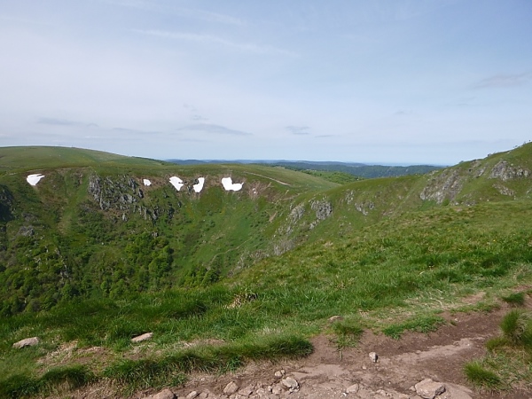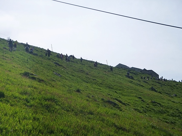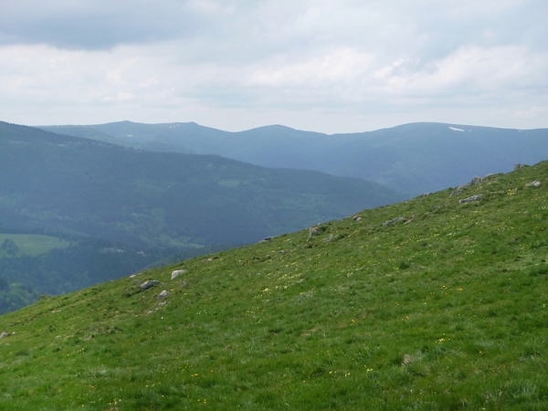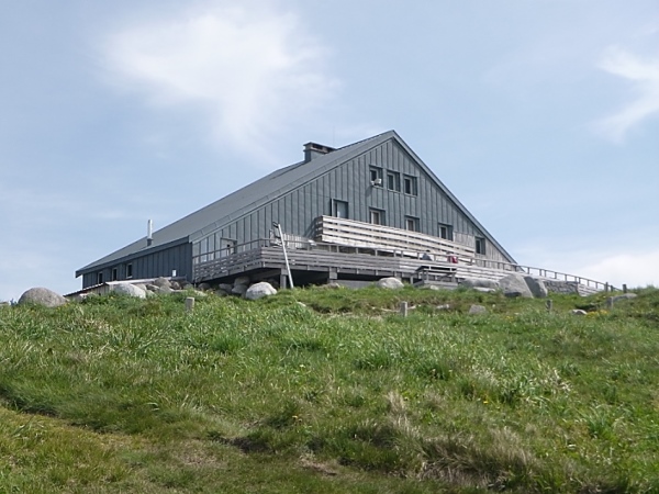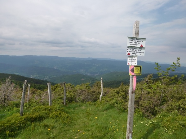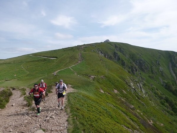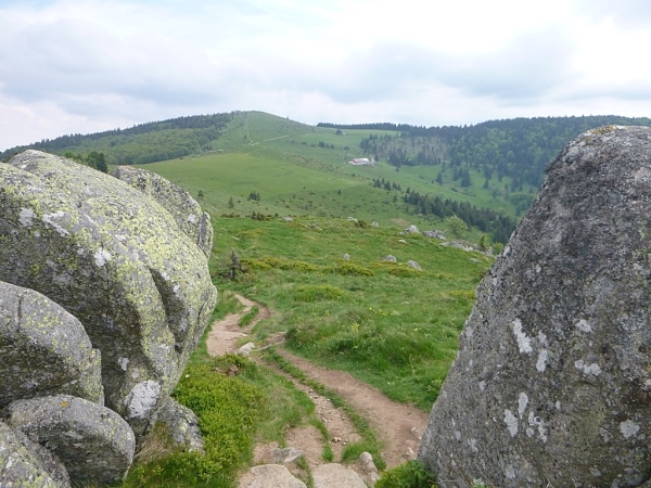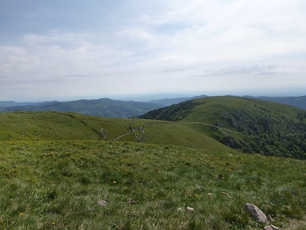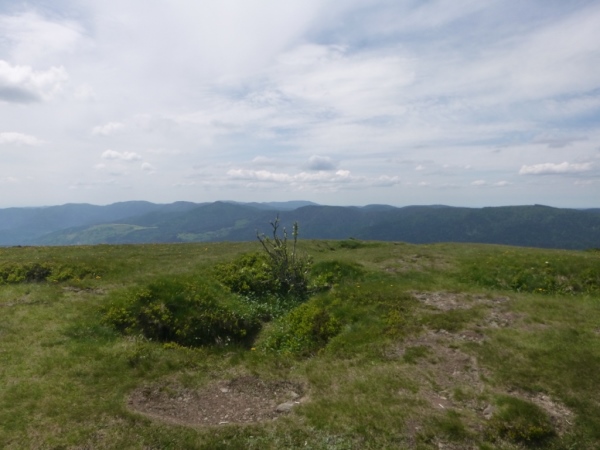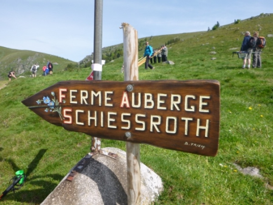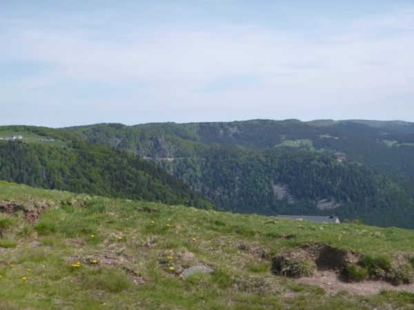 Der Pfad hinauf auf den Hohneck mit 1363 m (km 10,0) war sehr steinig und schwer zu laufen. Wir blieben jedoch unterhalb des Gipfelrestaurants. Entlang der Abrisskante blieben wir immer knapp unterhalb des Vogesenkamms bis km 15,0. Hier oben hatte ich einen herrlichen Blick auf die umliegenden Vogesenberge. Ein Blick zurück konnte ich noch einmal auf die Ferme-Auberge Schiessroth und auf das Gipfelrestaurant werfen.