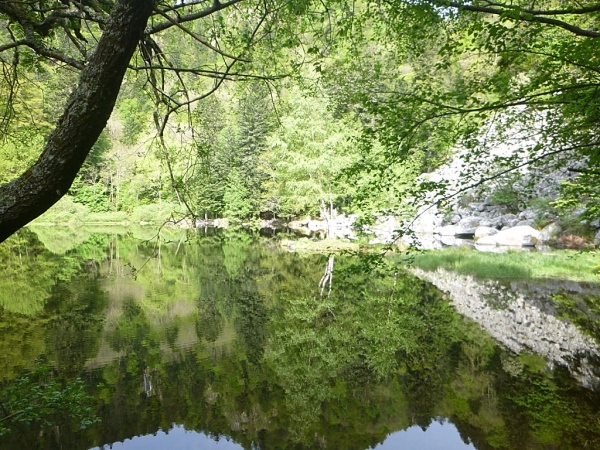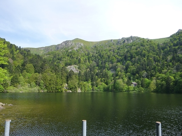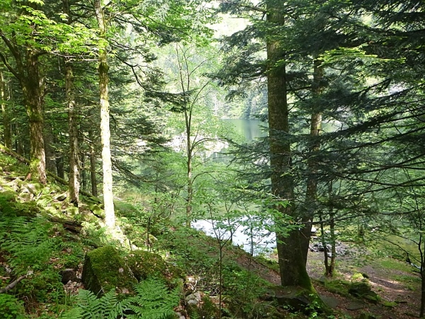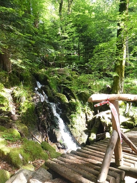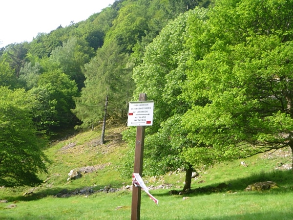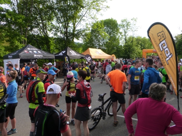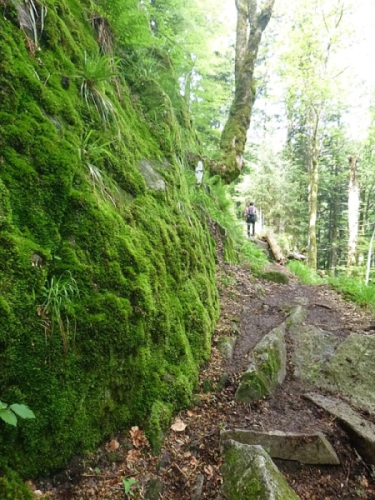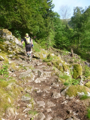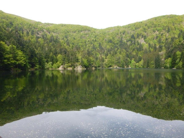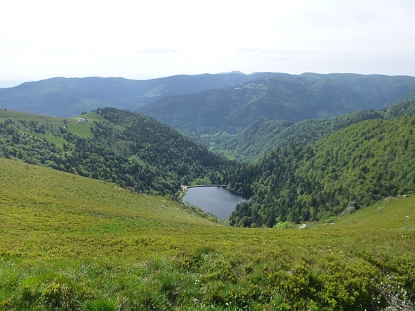 Nach zweistündiger Autofahrt hatten wir unser Auto auf einer noch feuchten Wiese nahe der Sporthalle geparkt und wollten zuerst unsere Startunterlagen abholen. Vor der Halle waren schon viele Trailläufer versammelt, überall hörte ich nur Französisch. Auf dem Weg zum Start hörten wir dann die Durchsage zuerst auf Französisch, dann auch in schlechtem Deutsch, dass der Start um ca. 15 Minuten verschoben wurde. Wir stellten uns trotzdem hinter der Startlinie auf, weil ja die Trailläufer von zwei Strecken gleichzeitig losliefen und schon jetzt ein riesiges Gedränge am Start war. Ein kurzes Briefing zur Strecke mit den geänderten Zeitlimits im Wechsel mit Musik sorgte für eine ausgelassene Stimmung unter den wartenden Läufern. Endlich war der Start freigegeben und ein Läuferstrom schlängelte sich den Berg hinunter über die Bahnlinie und dann in Richtung Metzeral. Nach etwa 4 Kilometer verließen wir das Münstertal, um auf den Hohneck, dem zweithöchsten Berg der Südvogesen, hinaufzusteigen. Ganz unvermittelt erreichten wir mitten im Wald den Lac de Fischbödle (km 6,0), einem der vielen idyllisch gelegenen Karseen der Vogesen.
