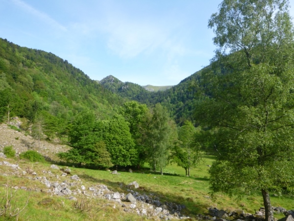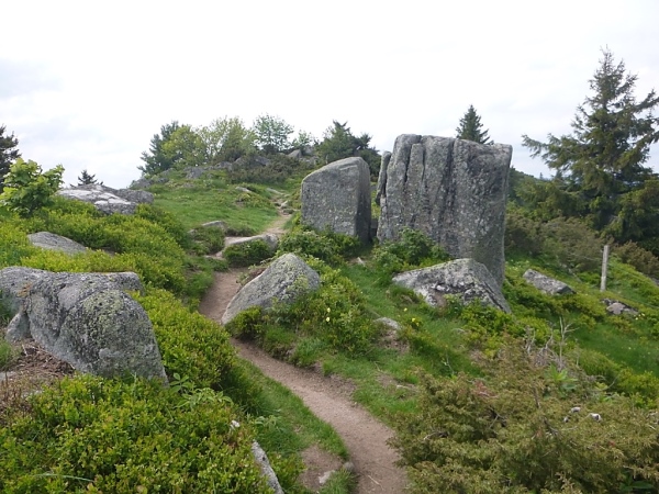 Gleich hinter dem Bauernhof war dann noch ein kurzer Anstieg bis zum Parkplatz unterhalb des Petit Ballons. Den Gipfel des Petit Ballons ließen wir rechts von uns liegen und bog in einen Wiesenpfad zurück ins Münstertal ein. Bevor ich den Abstieg begann, genoss ich noch einmal das Panorama auf den Petit Ballon und auf das vor mir liegende Münstertal, aber auch in die Rheinebene. Die letzten 10 Kilometer lief ich auf einem Grat zwischen riesigen Felsen hindurch, bevor die Strecke sich langsam bergab ins Münstertal schlängelte. Mal war der Weg breit, dann wieder ein schmaler Pfad, mal steil mal angenehm flach abfallend. So waren die letzten Kilometer recht kurzweilig! Als ich mich dem Ziel näherte, hörte ich bereits Stimmen und Musik unterhalb von mir, so hatte ich es wohl bald geschafft. Der Waldtrail endete auch direkt oberhalb des Zielportals, nur noch wenige Meter auf Asphalt.