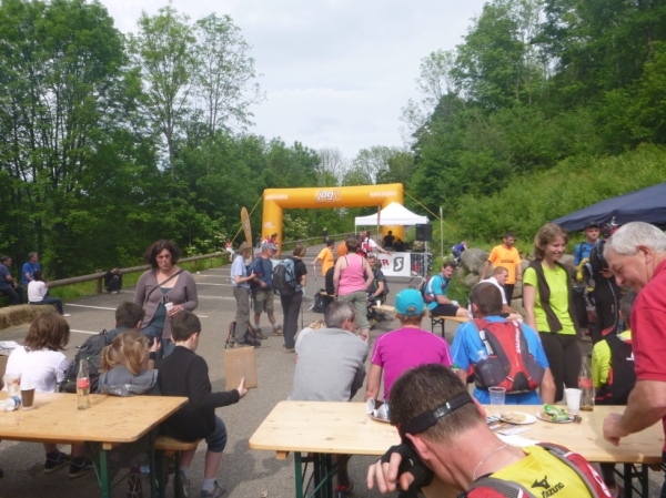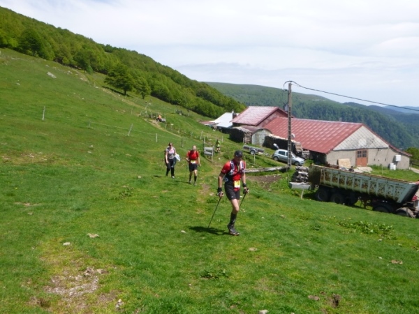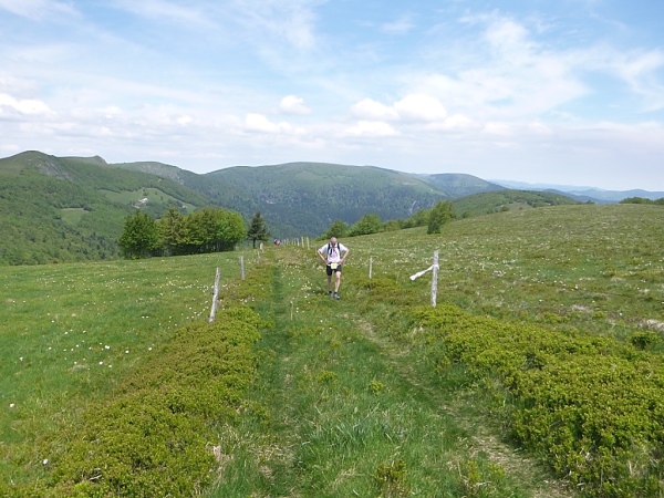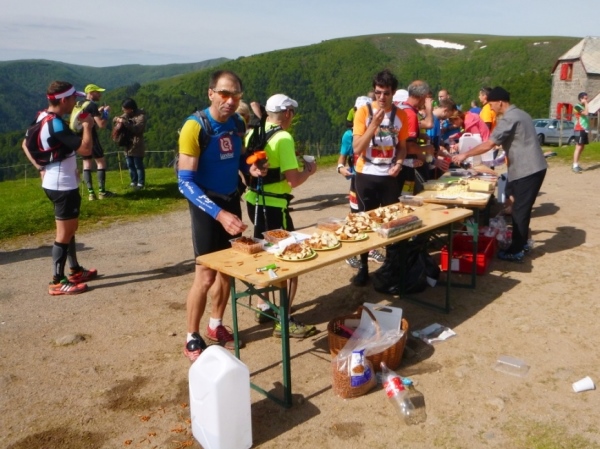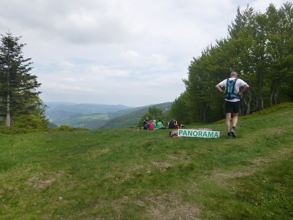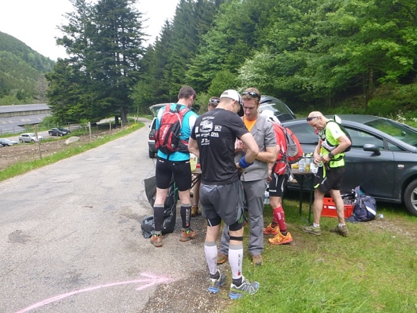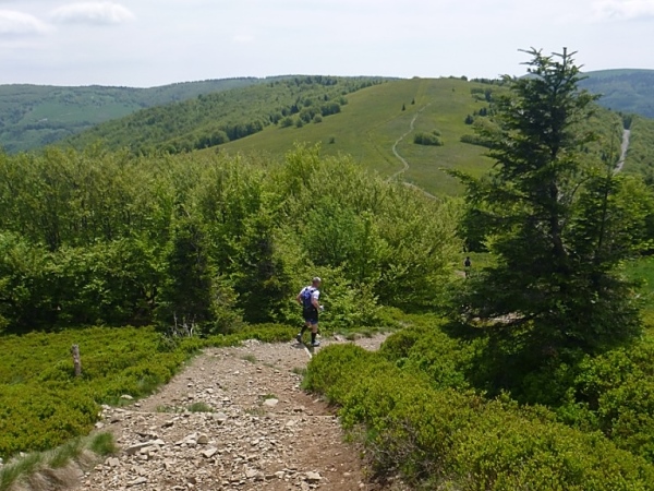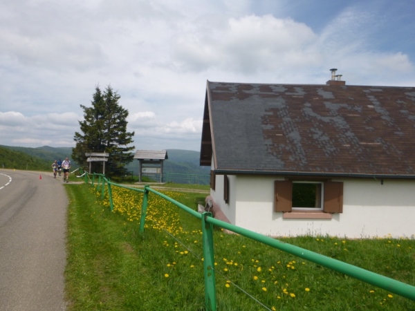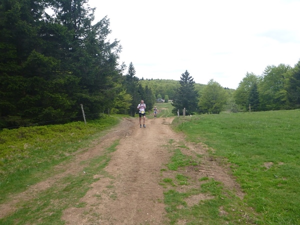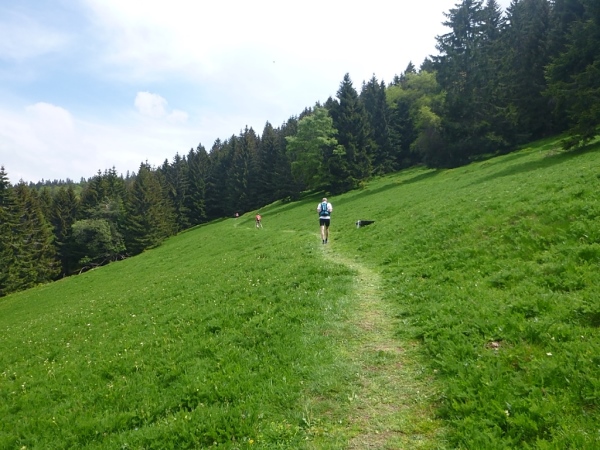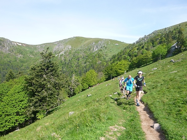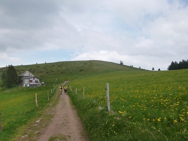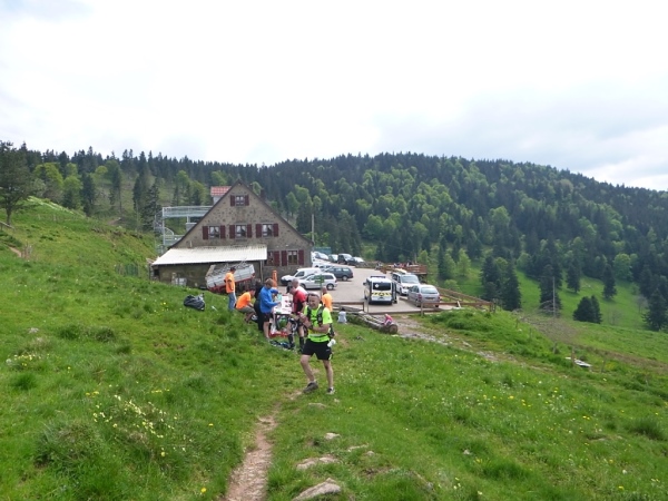 Die nun folgenden acht Kilometer führten uns über die grasbewachsenen Vogesenhochflächen bis zum Col d´ Oberlauchen (km 30). Wir hatten heute Glück mit dem Wetter und die Berge waren nicht in Wolken. Nach weiteren drei Kilometern bergab kamen wir an vereinzelt liegenden Häusern vorbei. An einer Wegkreuzung befand sich dann Raedlé (km 33/ 800 m) eine Getränkestelle, gleichzeitig war hier auch ein Zeitlimit um 14 Uhr 30 vorgesehen. Nun begann die Schleife zum Fuß des Petit Ballons in weiteren neun Kilometern mit einem bunten Wechsel durch den Wald und über Lichtungen oder über kahle Hochflächen. An der Ferme-Auberge Rothenbrunnen (km 42/1140 m) konnte ich mich dann das letzte Mal mit Getränken und Essen versorgen.