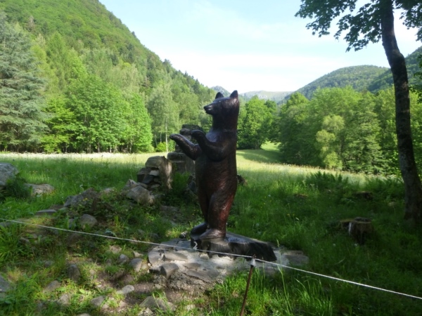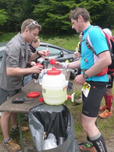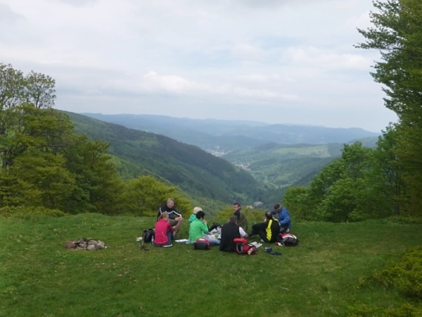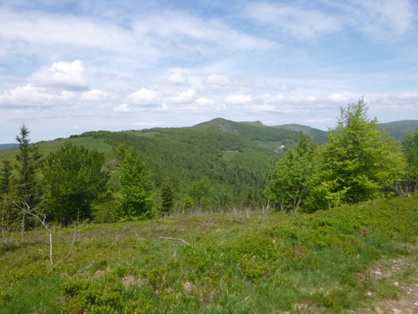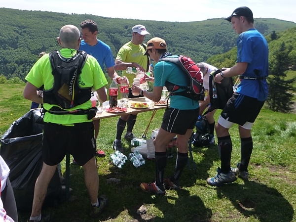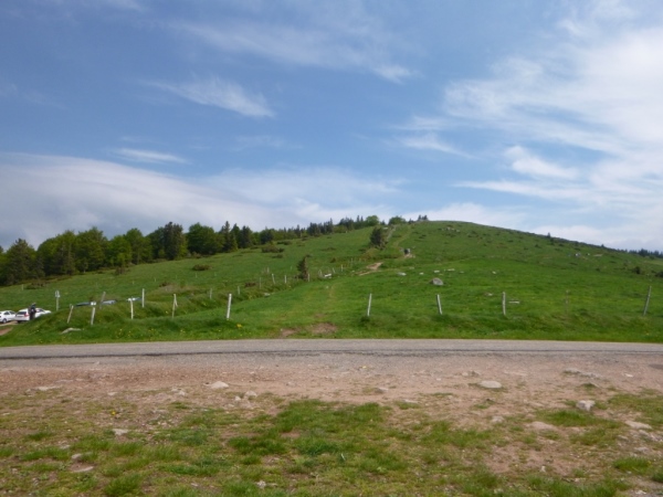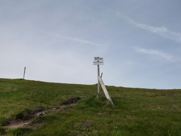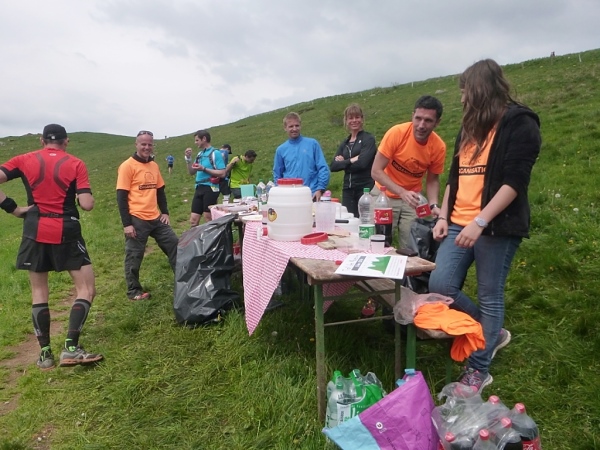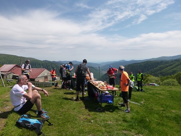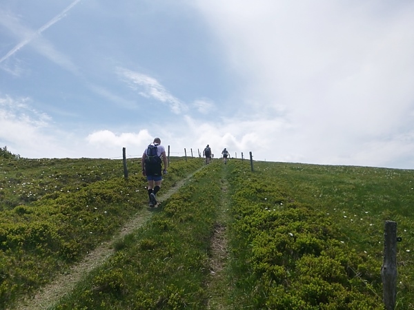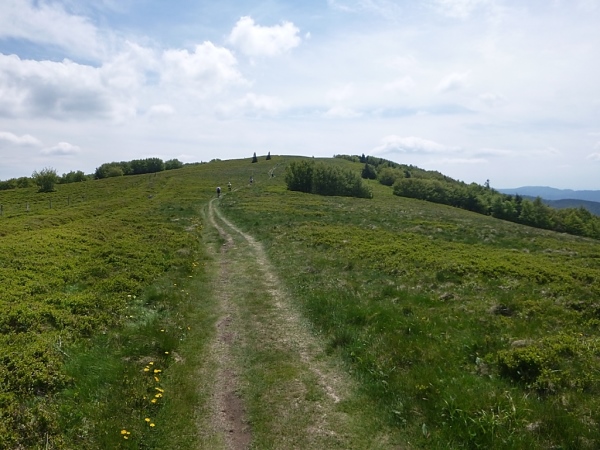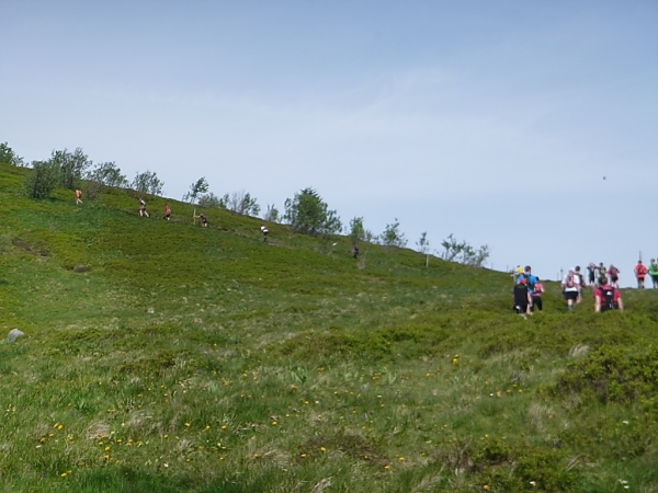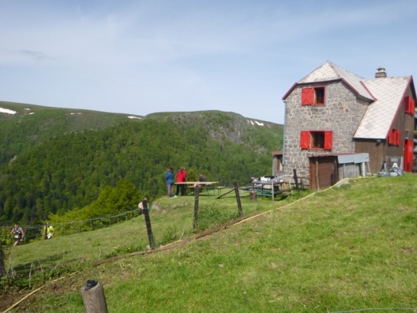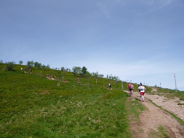 Die nun folgenden acht Kilometer führten uns über die grasbewachsenen Vogesenhochflächen bis zum Col d´ Oberlauchen (km 30). Wir hatten heute Glück mit dem Wetter und die Berge waren nicht in Wolken. Nach weiteren drei Kilometern bergab kamen wir an vereinzelt liegenden Häusern vorbei. An einer Wegkreuzung befand sich dann Raedlé (km 33/ 800 m) eine Getränkestelle, gleichzeitig war hier auch ein Zeitlimit um 14 Uhr 30 vorgesehen. Nun begann die Schleife zum Fuß des Petit Ballons in weiteren neun Kilometern mit einem bunten Wechsel durch den Wald und über Lichtungen oder über kahle Hochflächen. An der Ferme-Auberge Rothenbrunnen (km 42/1140 m) konnte ich mich dann das letzte Mal mit Getränken und Essen versorgen.