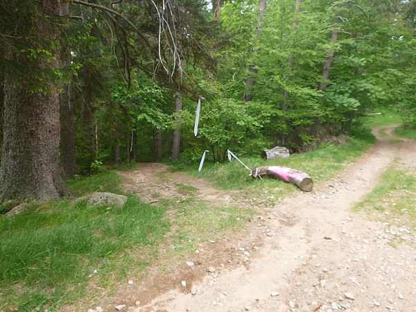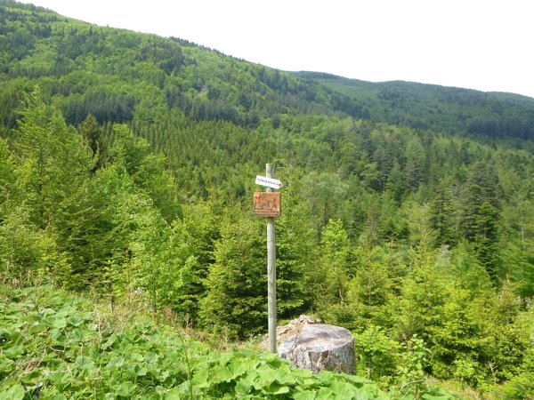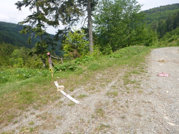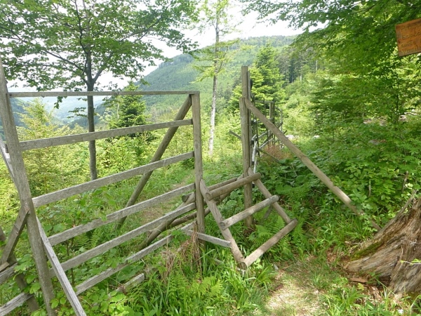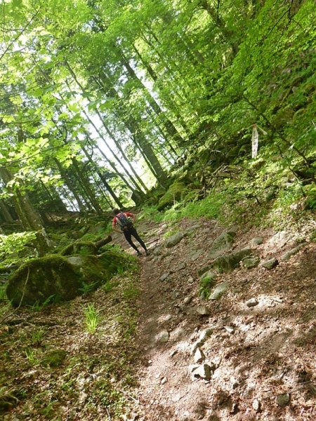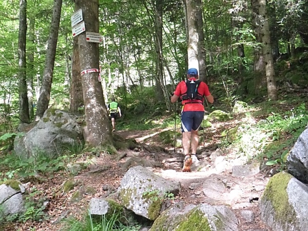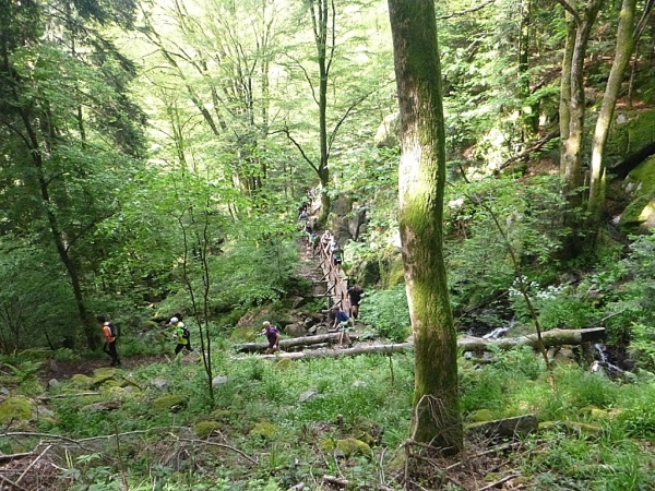 Zum Lac d´ Altenweiher (920 m) verloren wir dann wieder die hart erkämpften Höhenmeter in steilen engen Serpentinen. Bis dahin hatten wir schon einige schwierige Höhenmeter auf unwegsamen Pfad in unseren Beinen. Am Lac d´ Altenweiher (km 18,0) hatte auch der Veranstalter ein Zeitlimit eingerichtet, vor 11 Uhr 45 sollten alle Trailläufer der 52 km-Strecke durchgekommen sein. Wer zu spät dran sein würde, müsste nun auf die 31 km-Strecke wechseln. Die Stelle der Streckentrennung war für alle sichtbar mit gelben Schildern markiert, so dass keiner in die falsche Richtung laufen konnte. Nachdem die Läufer der 31 km–Strecke abgebogen waren, war ich so gut wie allein auf der Strecke unterwegs. Auf einem steilen Zickzacktrail ging es erneut hinauf auf die Hochfläche der Vogesen, wo sich dann auf einer Wiese die Ferme-Auberge Steinwasen (km 22/zweite Verpflegung) befand.
