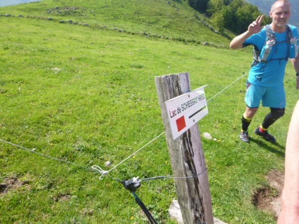 Ein weiterer, kurzer Anstieg brachte uns zum Lac du Schiessrothried (km 7,0), den wir über die Staumauer passierten. Bereits auf diesen ersten sieben Kilometern mussten wir immer wieder das Tempo herausnehmen, da sich der Läuferstrom an den Engstellen staute. Der Grund hierfür war sicherlich der gemeinsame Start der Läufer der 52 km-Strecke und der 31 km-Strecke. Zur gleichnamigen Ferme-Auberge Schiessroth, ein bewirteter Bauernhof mit Produkten aus eigener Herstellung, ging es dann noch einmal in engen Serpentinen steil bergauf. Gleich hinter der Ferme-Auberge (km 8,0) wartete dann die erste der drei Verpflegungspunkte mit der üblichen Trailverpflegung und mit Alphornmusik im Hintergrund.