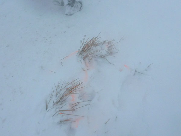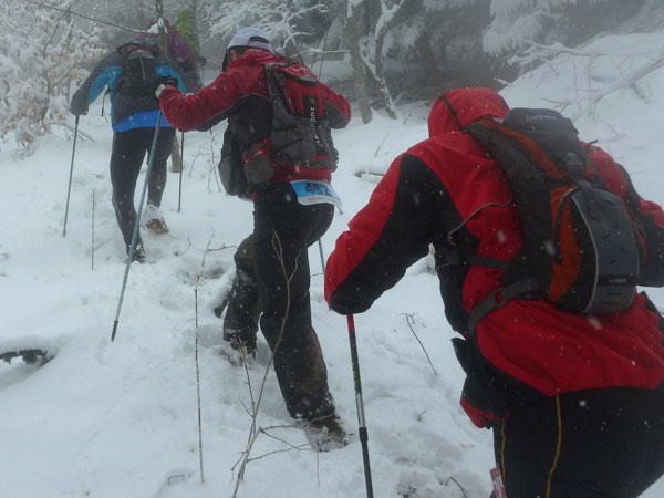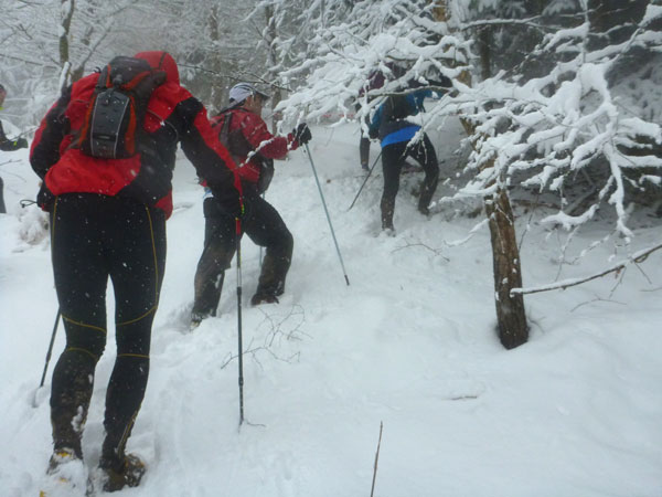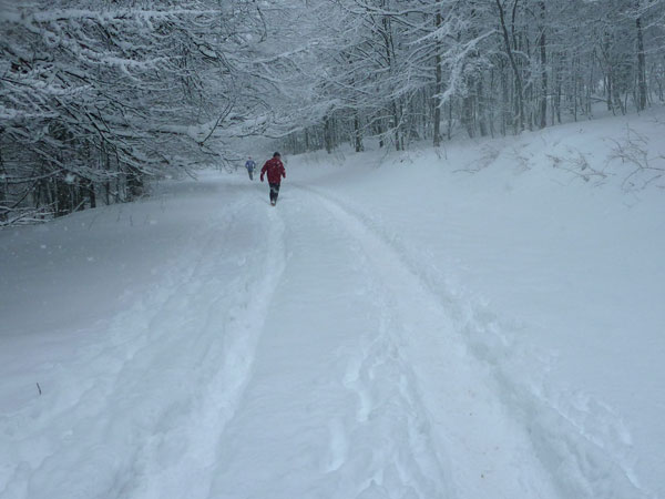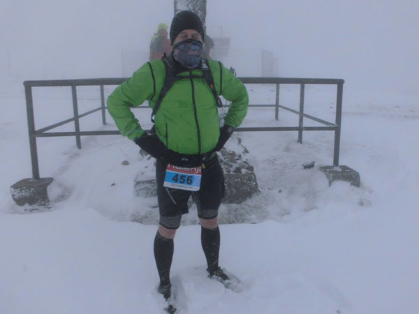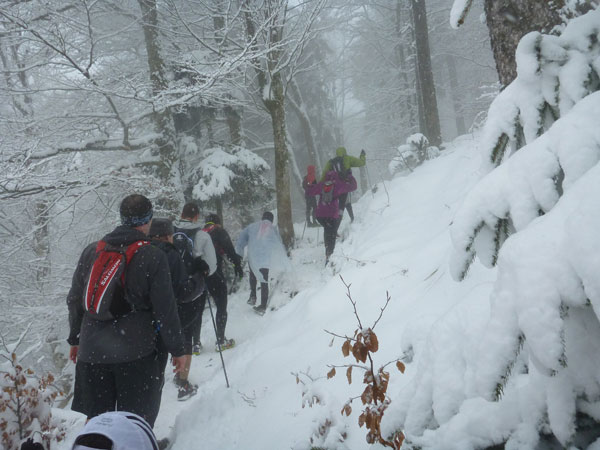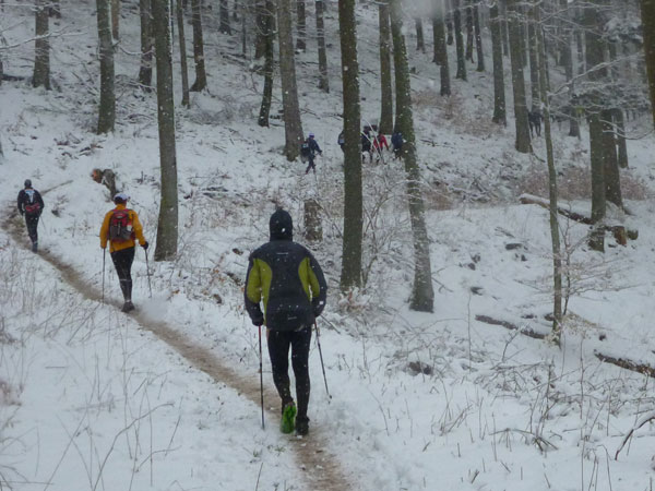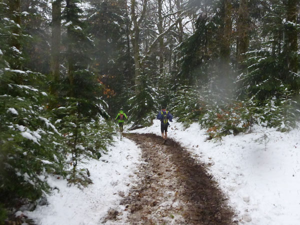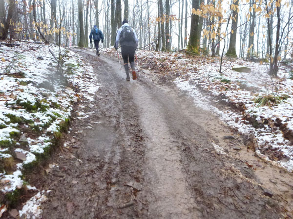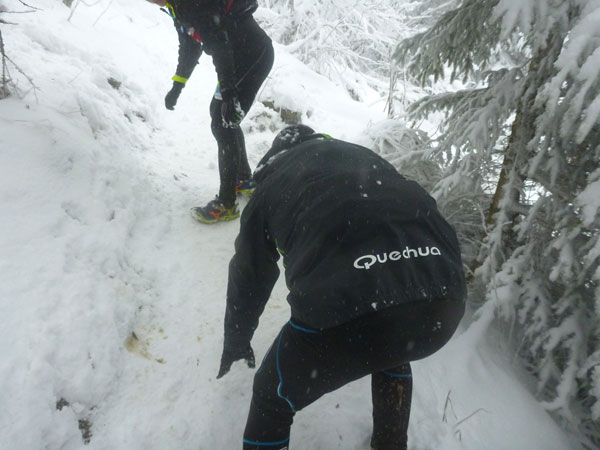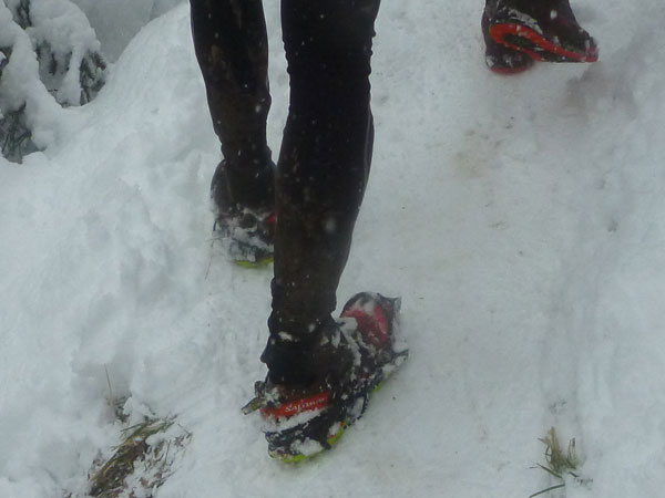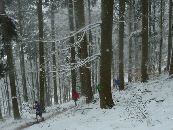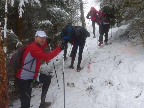 Weiter geht’s zum finalen Gipfelsturm. Den Singletrail durch den Wald habe ich vom Vorjahr noch in allerbester Erinnerung. Heute beginnen hier die größten Herausforderungen des Tages. Kaum einer kann sich ohne Zuhilfenahme sämtlicher Extremitäten auf den Füßen halten und so kämpfen wir uns mühsam Meter für Meter nach oben. Wo es geht, wird durch den Tiefschnee gestapft um der Eispiste zu entrinnen. Ein paar wenige ganz Clevere sind aber auch dabei, sie haben Yaktrax aufgeschnallt und zeigen uns sprichwörtlich die lange Nase. Zweifelsfrei hätte man heute größte Schwierigkeiten, diesen Pfad abwärts, wie im Vorjahr, unversehrt zu bewältigen.