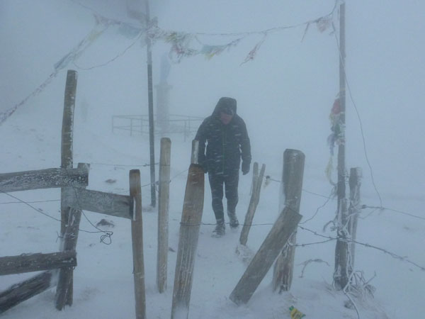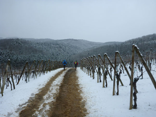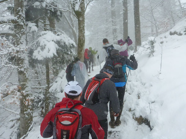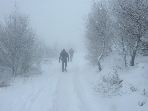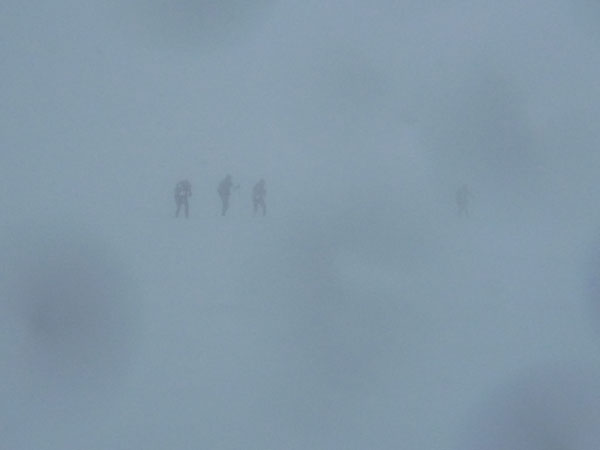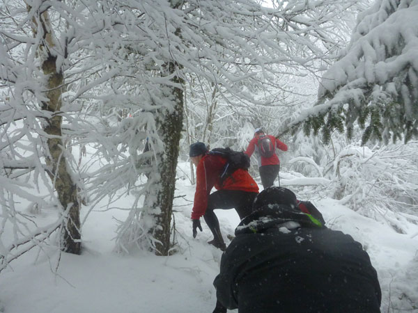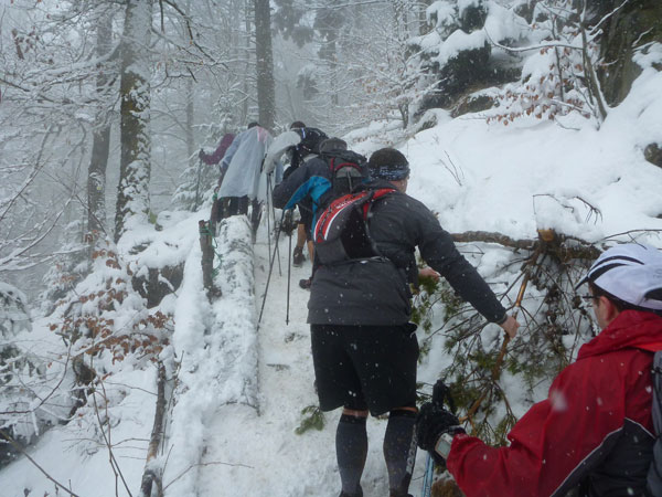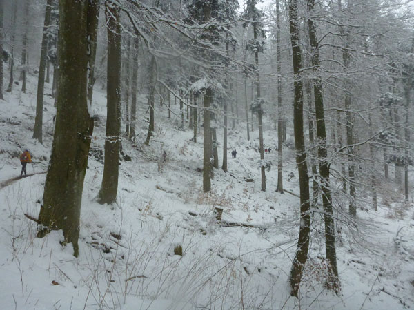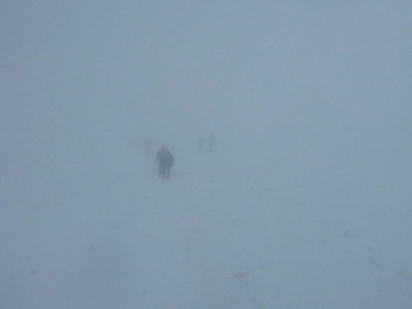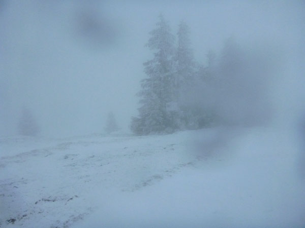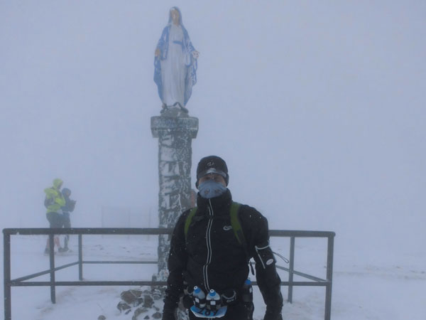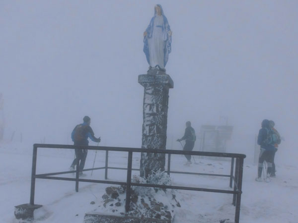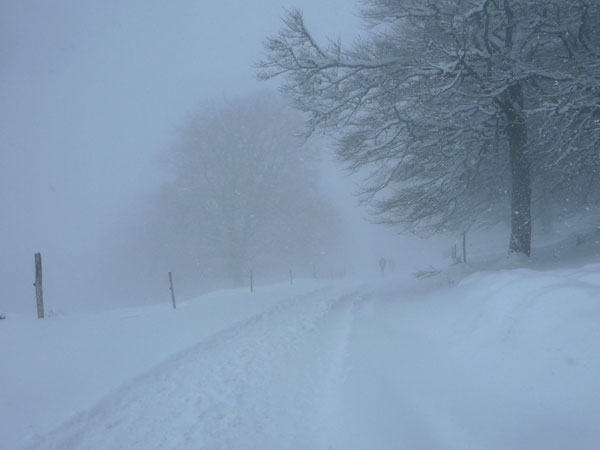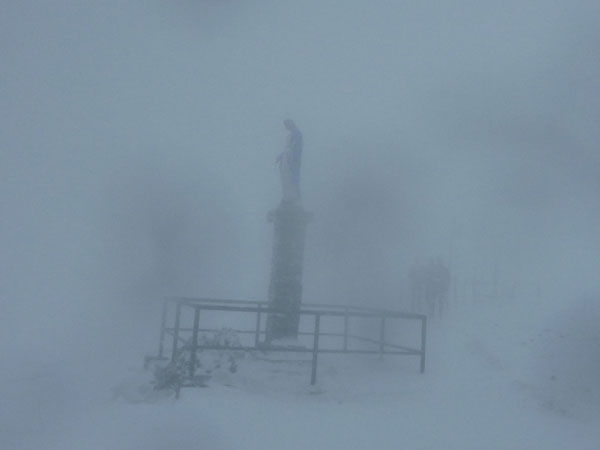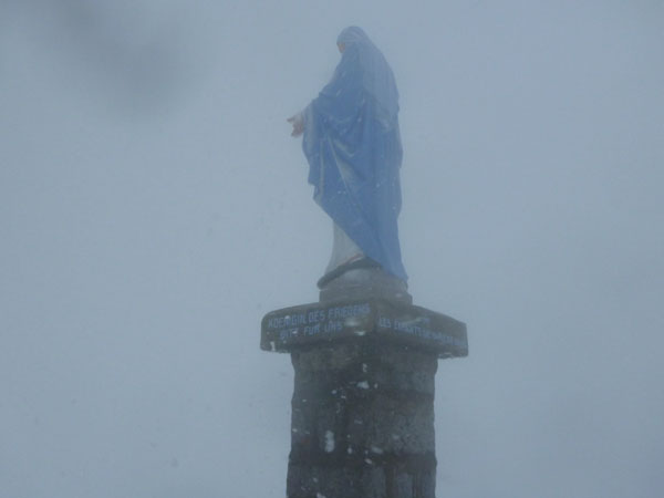 Zu Eis und Schnee kommt noch dichter Nebel, als wir die Baumgrenze und die schneebedeckten Stoppelfelder der Haute Chaumes erreichen. In Serpentinen geht es über freies Feld hoch zur Marienstatue, der Gipfelmarkierung des Petit Ballon. Nur noch Schemenhaft sind Vorder- und Hintermänner auszumachen. Der Schnee bläst uns fast waagerecht ins Gesicht. Zwar ist das hier nicht unbedingt ungewöhnlich, in den Vogesen herrscht stets ein strenges Klima. Im Winter vergleichbar mit Island, im Sommer häufig kühl mit rauen Stürmen und 2.000 mm Regen und Schnee im Jahresschnitt. Aber warum denn unbedingt heute?