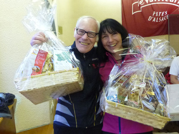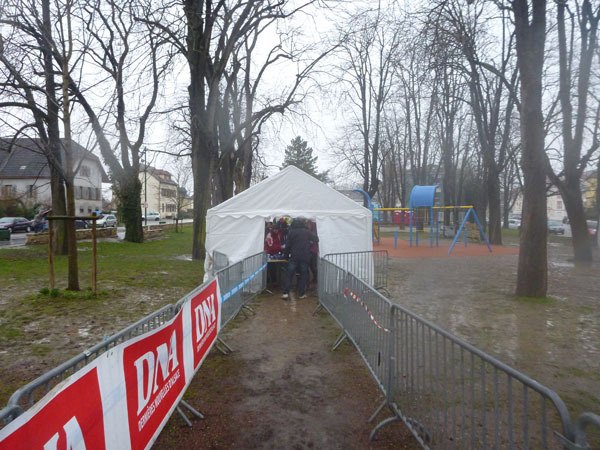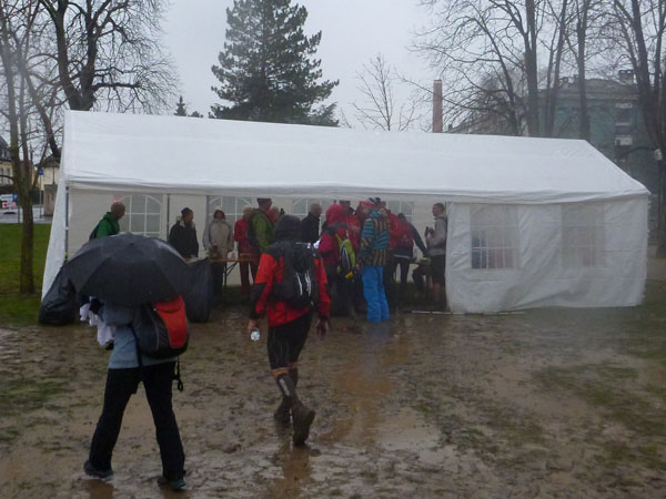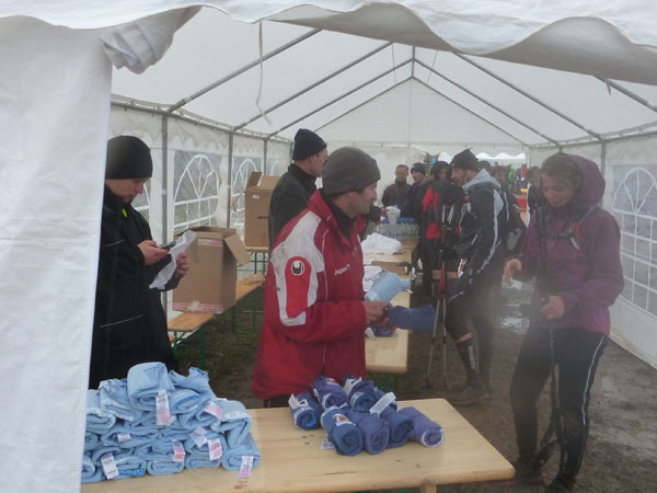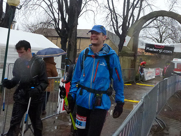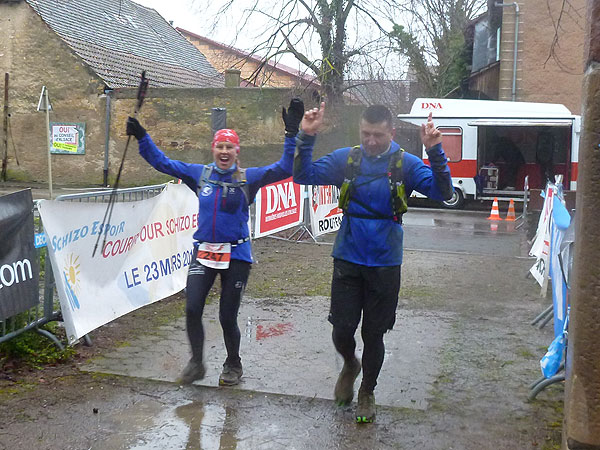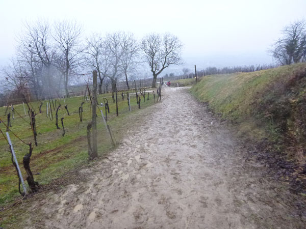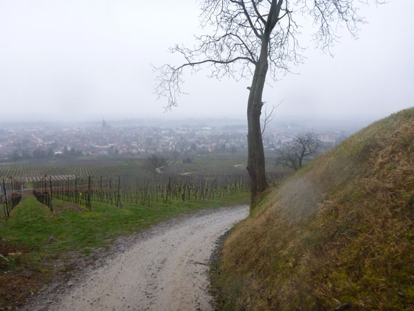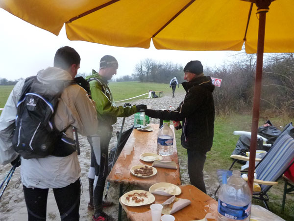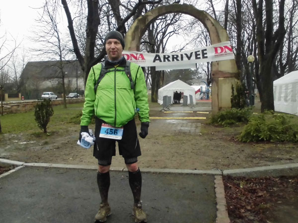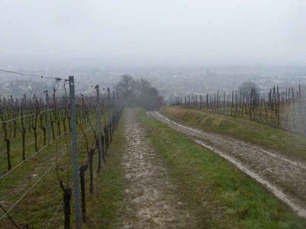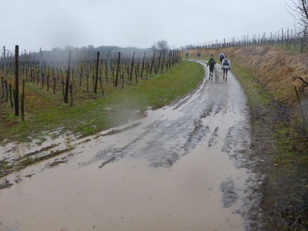 In Sichtweite der l’Eglise, der von weitem schon hervorstechenden Kirche von Rouffach, bekommen wir zum krönenden Abschluss noch einmal ein Schlammbad vom Feinsten. Ein schmaler Pfad durch ein Wäldchen lässt uns nicht die geringste Möglichkeit, irgendeinen unbefleckten Quadratzentimeter unserer Laufschuhe ins Ziel zu bringen. Ein letzter Downhill durch die Weinfelder und das Ziel an der Allee de Humaniste ist erreicht. Finishershirt und ein Mirofaserhandtuch werden direkt nach dem Zieldurchlauf überreicht.