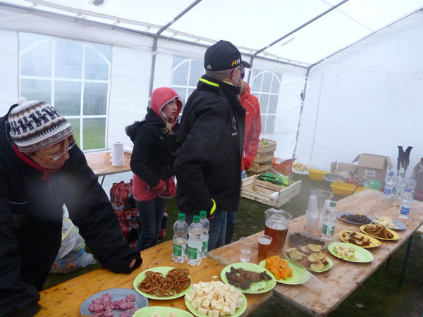 Wie ist es meinen Ultra-Novizen ergangen: Leider hat es auch Charly unterhalb des Gipfels erwischt, bei seinem achten Sturz knickte er grauslig um und holte sich eine schwere Kapsel- und Bänderzerrung, humpelte aber noch bis zum Cut in Osenbach (km 40,5), begleitet von Greppi. Als Letzter wird er aus dem Rennen genommen und mit dem Auto ins Ziel chauffiert, ist da aber heute nicht der Einzige. Greppi darf im gesunden Zustand noch weiter, ist gut drauf und kann sogar noch ein paar vor ihm liegende kassieren und darf sich jetzt auch Ultraläufer titulieren.