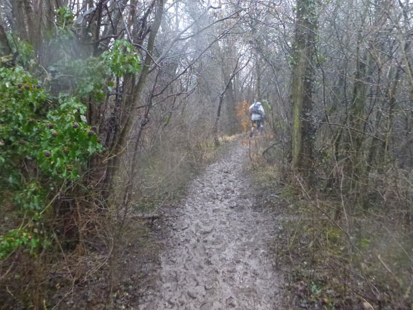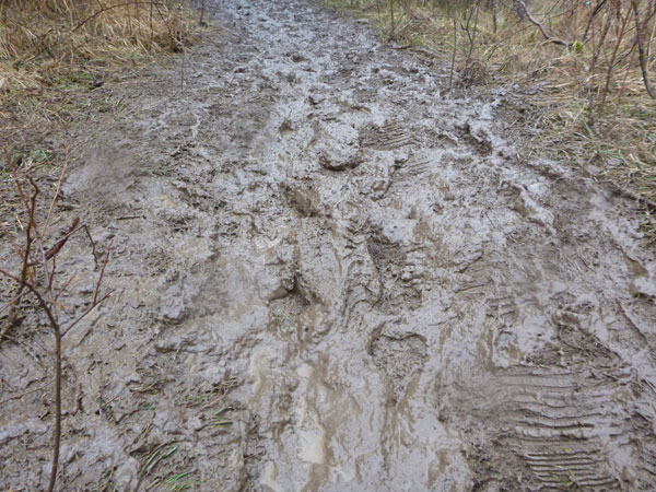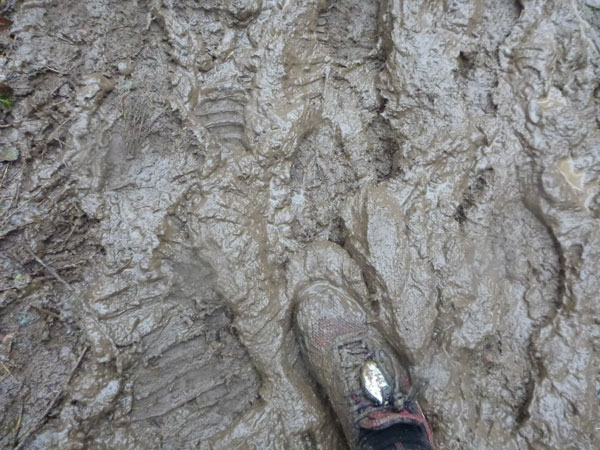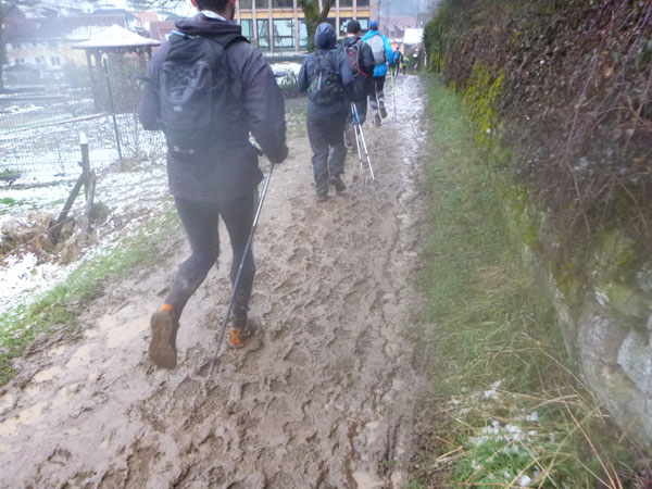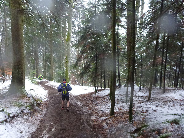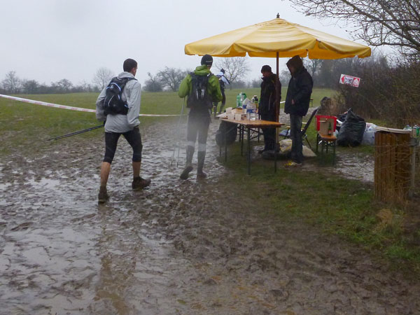 Urplötzlich drehe ich eine Roulade durch die Suhle, das trifft mich hart, hinter mir sind einige, die meine gratis Fangopackung miterleben. Einmal abgerollt, geht es unbeschadet weiter und ist man erst einmal den Schlamm gewohnt, stört er auch kaum noch. Osenbach erreiche ich deutlich außerhalb der ursprünglichen Cut-Off-Zeit, da ist man aber scheinbar heute davon abgegangen, es ist auch noch ein umfangreiches Aufgebot hinter mir. Besser wird die Strecke auch nach der Ortsdurchquerung nicht. Im Gegenteil, zum Schlamm kommen auch noch große Wasserpfützen. Man könnte jetzt auch sagen: Trailers Paradise. Auf einem Abschnitt bin ich ganz alleine unterwegs und bin scheinbar zu unkonzentriert. Nein, kein Sturz, dieses Mal nehme ich eine falsche Abzweigung, das bringt einige hundert Zusatzmeter. So bekomme ich heute wenigstens meine 50 km voll.
