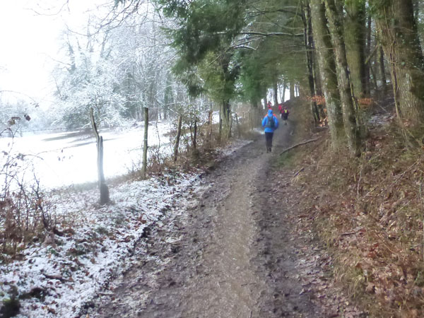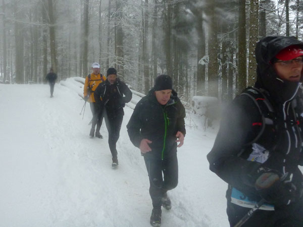 Etwas unterhalb führt ein Weg um die Kuppe in einer 30 cm tiefen Traktorspur herum …oder wahlweise im Tiefschnee, der gewährt wenigstens festen Stand. Nach einer Schranke geht’s erneut abwärts, sofort ist wieder höchste Aufmerksamkeit angebracht. Der Balanceakt geht weiter. Ich kann die Beinahe-Stürze gar nicht mehr zählen und bin deswegen auch ziemlich verunsichert und vorsichtig, trotzdem will ich bergab unbedingt laufend bewältigen. Kollateralschäden gibt es heute zuhauf. Verena schmerzt der Rücken vom unsanften Aufprall. Jens steht geknickt am Wegesrand und hält sich seine gebrochene Hand. Bei der nächsten Unterhaltung legt sich eine Gesprächspartnerin direkt vor meine Füße.