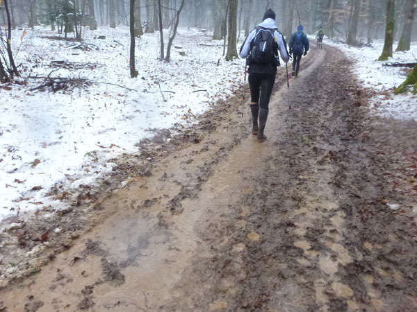 Ab dem Col du Firstplan wird der Schnee zusehends weniger, der Schlamm dafür umso tiefer. Von hier gäbe es auch eine direkte Möglichkeit, um ins Vallée de Munster zu gelangen, dort wird der berühmte Elsässer Weichkäse bereits seit dem siebten Jahrhundert und immer noch von Hand hergestellt. Benediktinermönche in Münster waren die Urheber der Produktion. Zu dieser Zeit diente der Vorgang dazu, die Milch haltbar zu machen. Westlich des Gebirgskamms in Lothringen wird der würzige „Stinkerkäse“ im Übrigen Géromé genannt. Da ich aber bereits den Kofferraum bei der Herfahrt vollgeladen habe, nehme ich doch lieber weiter die markierte Strecke.