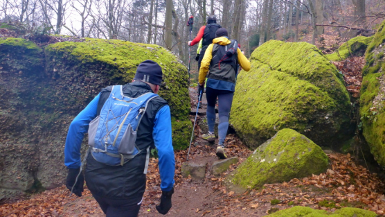 Nach Soultzmatt verlassen wir die Weinberge und wechseln in den Wald. Vor dem ersten Single Trail gibt es einen riesigen Stau. Läufer, die versuchen, sich an der Menge vorbei zu mogeln, werden laut ausgebuht. Geduldig warten wir, bis es weitergeht. Ich verliere dabei gut zwanzig Minuten und auch auf dem anschließenden Aufstieg geht es nur langsam vorwärts. Hätte ich doch besser vorher ein wenig Gas gegeben. Auf dem folgenden Waldweg geht es lange leicht bergab. Ich nehme wieder Tempo auf und so langsam wird mir auch wieder warm. Dann folgt der erste längere Aufstieg durch den Wald.