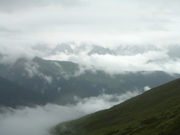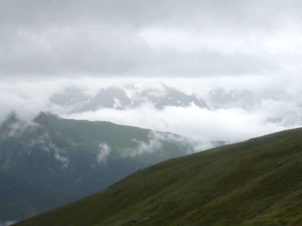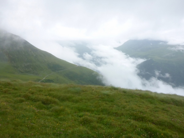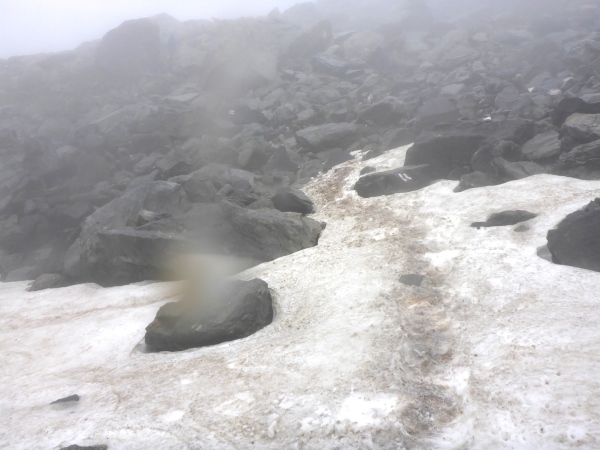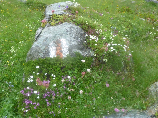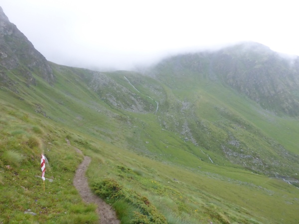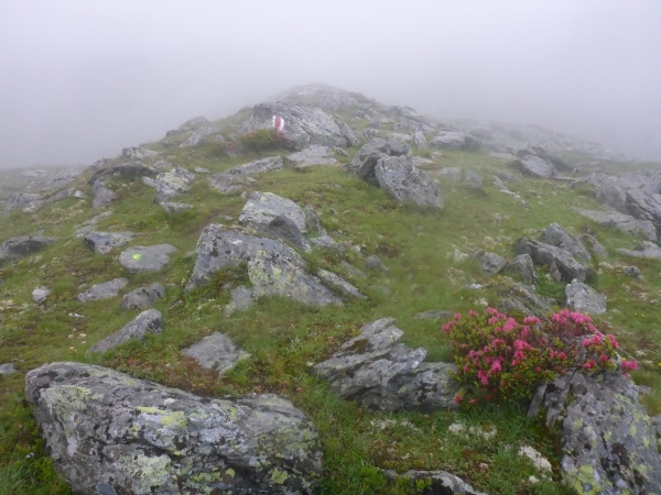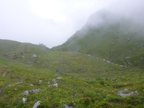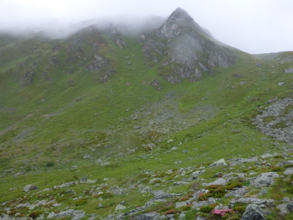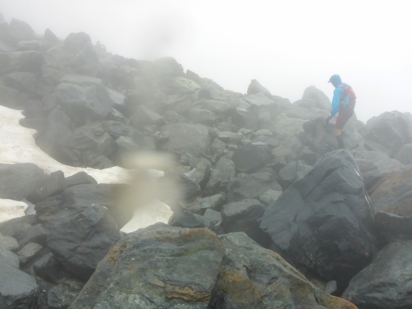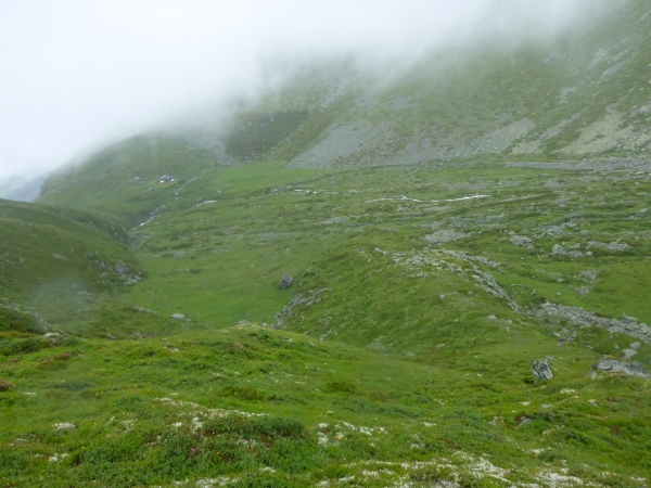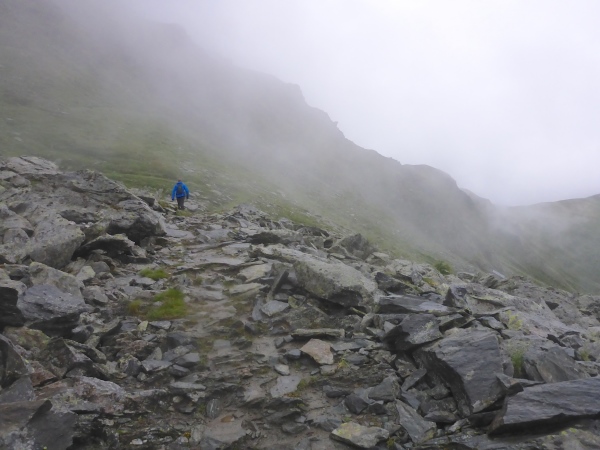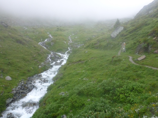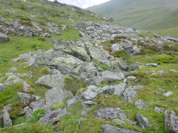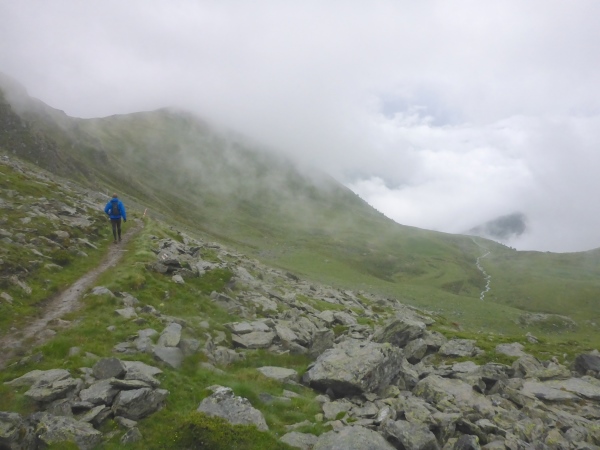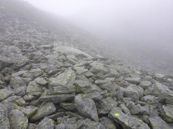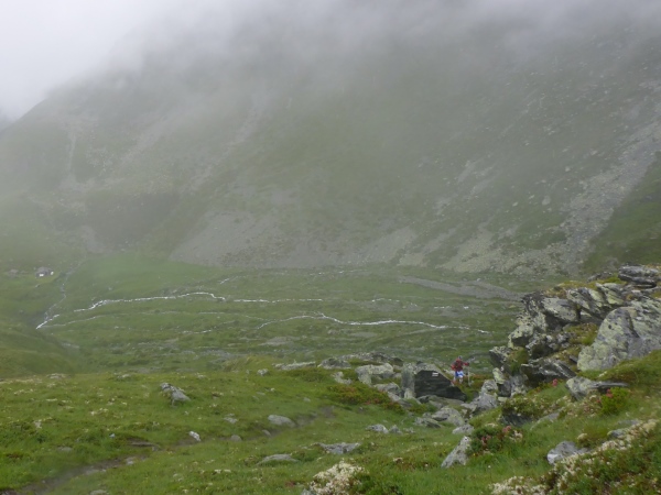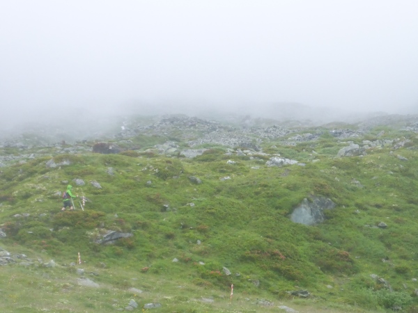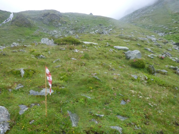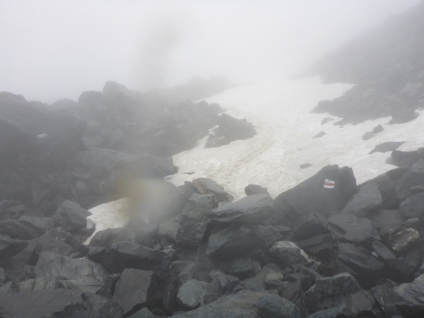 Ca. 300 Höhenmeter geht es hinauf. Manchmal folgen wir nur Wegspuren, aber dank der Markierungen gibt es keine Probleme mit der Orientierung. Kurz steigen wir über ein Blockfeld, welches aber deutlich einfacher ist als das, was noch vor uns liegt. Normalerweise hat man vom höchsten Punkt dieses Streckenabschnitts auf 2643 m einen grandiosen Blick auf die naheliegenden Gletschern.