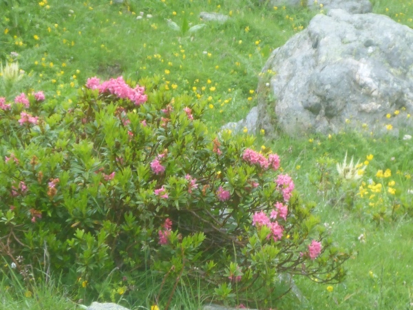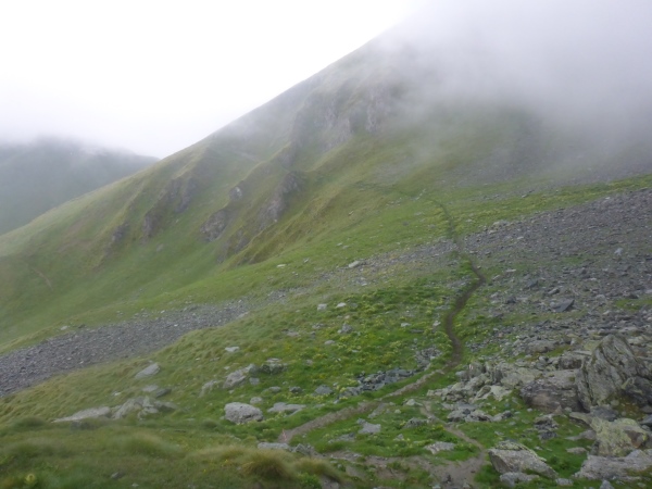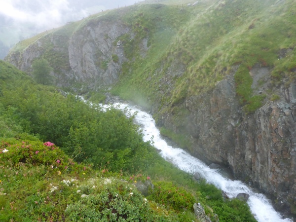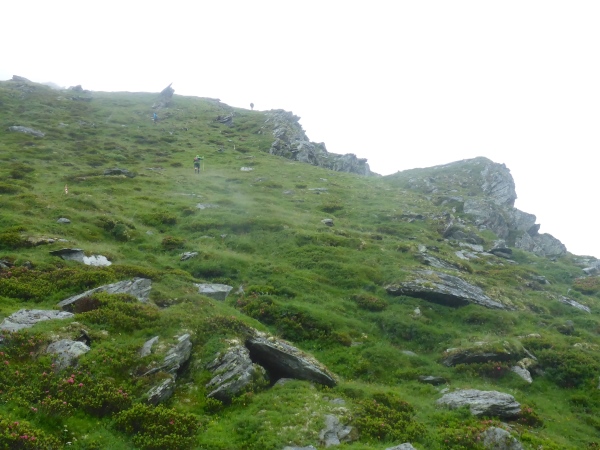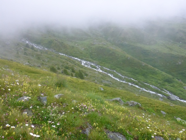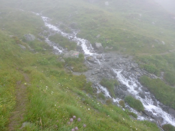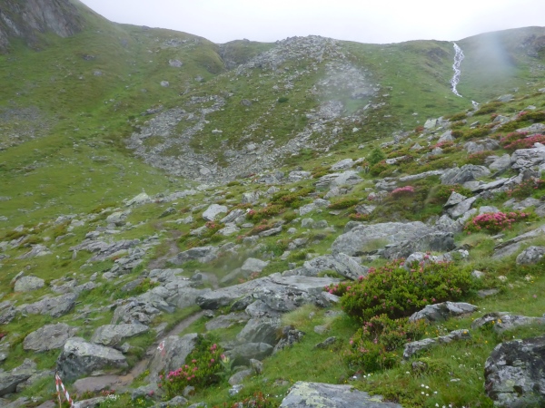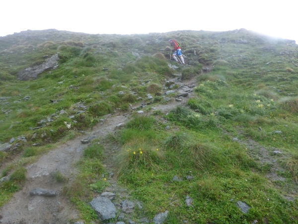 Erneut geht es anstrengend bergauf. Vorbei an einem schönen Wasserfall gewinne ich schnell an Höhe und hoffe, auf diese Weise recht bald den höchsten Punkt der Strecke zu erreichen. Ich laufe nun schon stundenlang fast ausschließlich durch dichten Nebel. Statt der schöner Aussichten bewundere ich die vielen schönen Bergblumen.