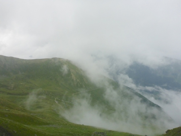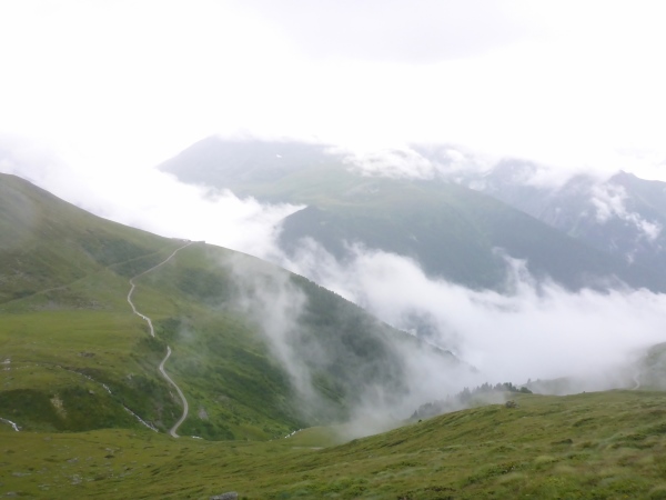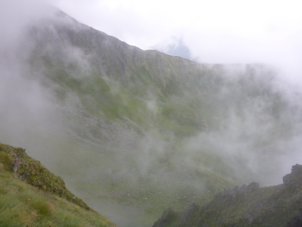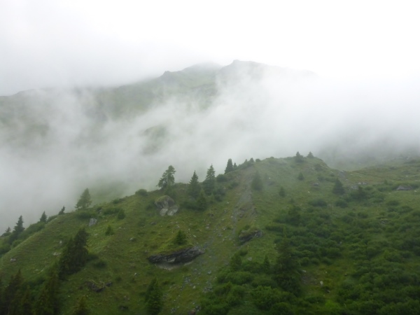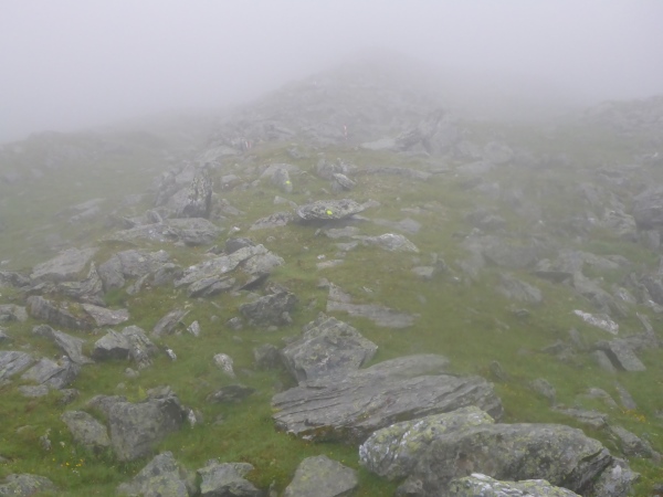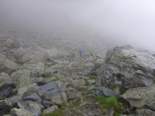 Nachdem ich im dichten Nebel endlich den scheinbar höchsten Punkt erreicht habe, führt der Trail steil in die Tiefe. Dann folgt der nächste Aufstieg. Dann der nächste Abstieg. Dann der nächste Aufstieg. Dann der nächste Abstieg. Nervt euch diese Wiederholung? Mich auch! Da ich nach wie vor von der Umgebung nichts sehen kann, habe ich keine Ahnung, wie weit es noch bis zur Hütte ist.