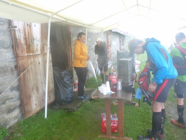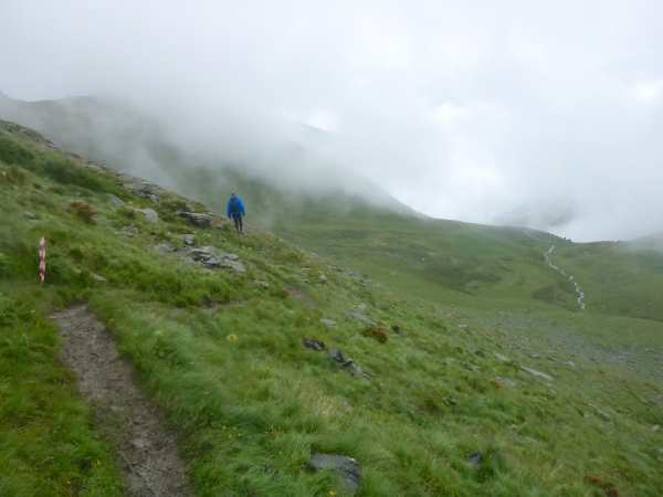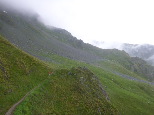 Weiter geht es mal bergauf, mal bergab, meist auf einigermaßen gut laufbaren Trails, nur ab und zu über rutschigen Schlamm. Manchmal sehe ich etwas von der Umgebung, dann umhüllt mich wieder ödes Grau. Ab und zu überqueren wir Bäche. Nasse Socken sind heute Dauerthema. An einem kleinen Pass reißt kurz die Wolkendecke auf, und ich erkenne in der Ferne ein paar hohe Gipfel. Hier steht ein Streckenposten in der Kälte und passt auf, dass die 45 km-Läufer links aufsteigen, wogegen die 21 km-Läufer geradeaus bergab laufen.