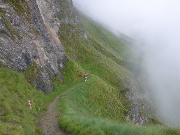 Doch langweilig wird es trotz Nebel dank der äußerst anspruchsvollen Wegführung nie. Wenn ein Schlamm-Fan wie ich manche der heutigen, extrem steilen und rutschigen Abstiege als grenzwertig bezeichnet, will das was heißen. Halleluja, ist das manchmal eine böse Rutscherei! Der „Höhepunkt“ kommt, als ich ausrutsche und mehrere Meter auf dem Rücken liegend neben dem Trail den Hang abwärts schlittere. Gar nicht lustig! Der Läufer hinter mir bekommt einen ordentlichen Schreck.