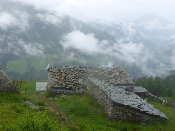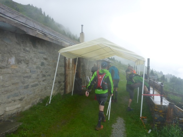 Dann geht es etwa 600 Höhenmeter bergab, oft steil und sehr rutschig. Wo der Trail in einen Fahrweg mündet, treffe ich wieder auf die kürzere Route der 21 km-Läufer. Wer hier nicht aufpasst und statt zu dem Flatterband links unten zum Pfad rechts läuft, der wird irgendwann zurück zur Cabane de Mille kommen und seinen Irrtum erkennen.