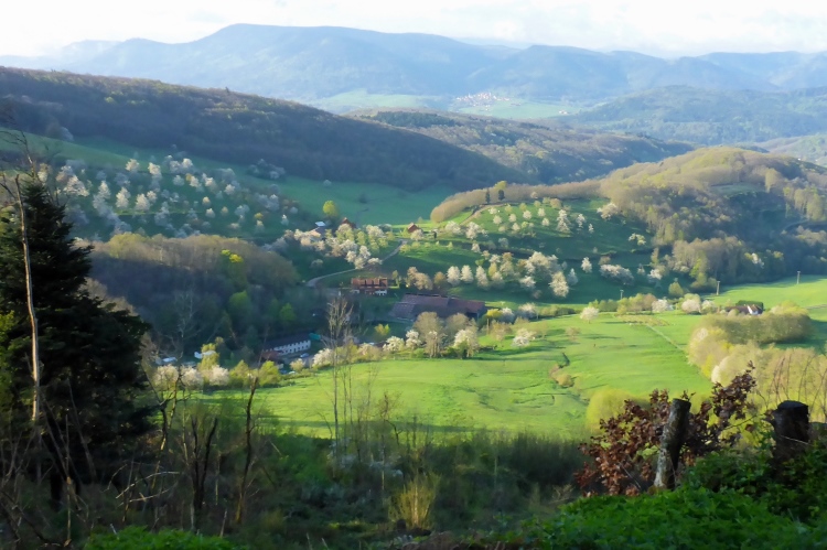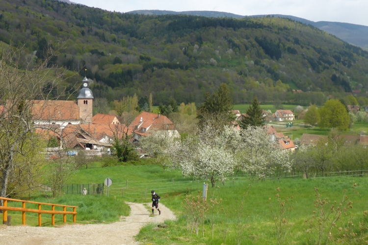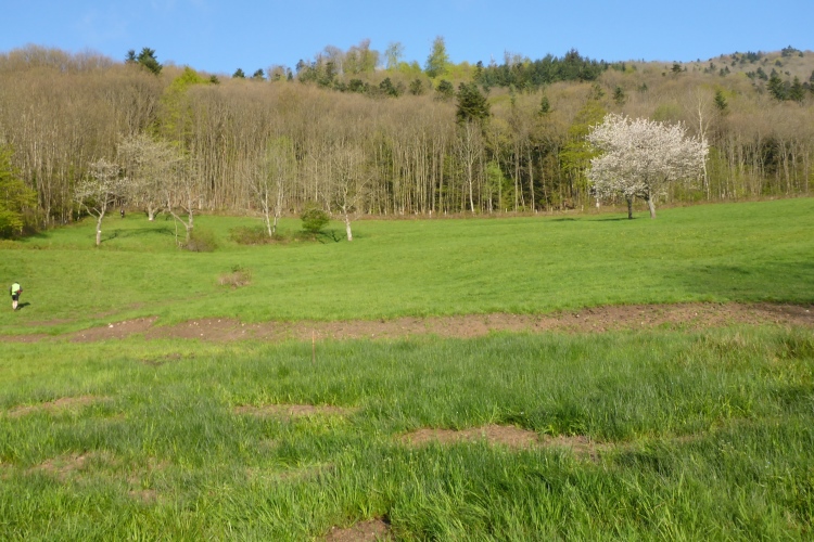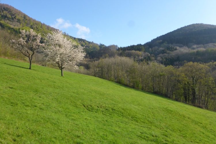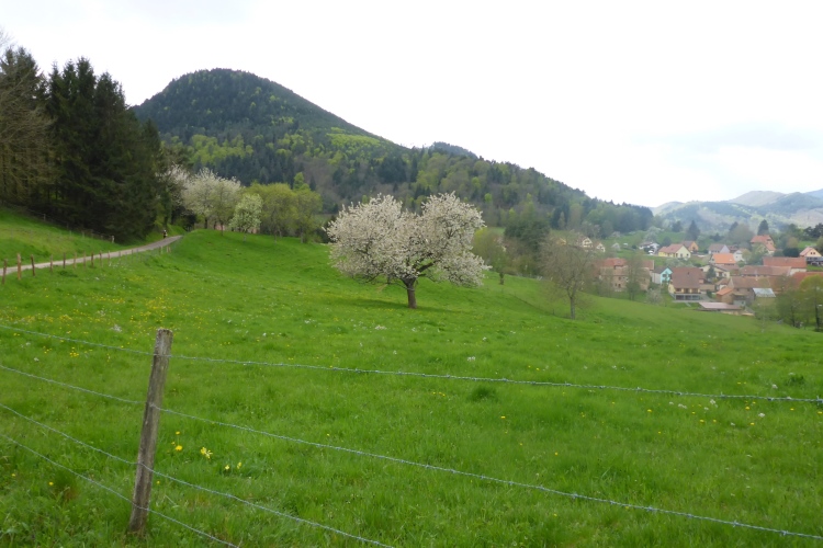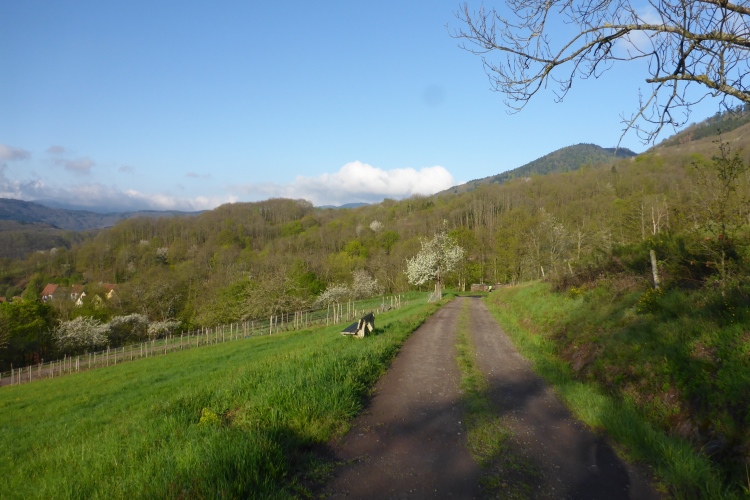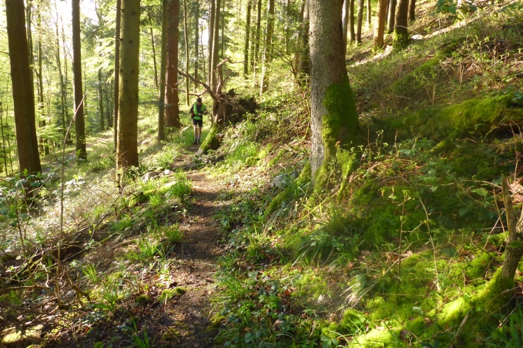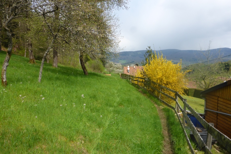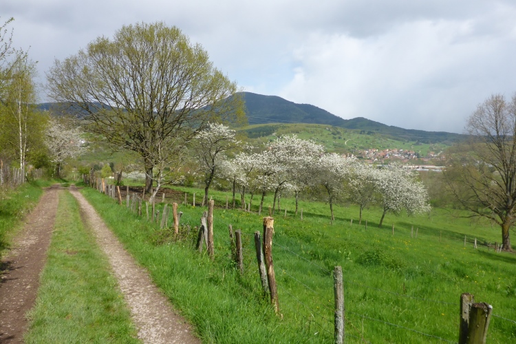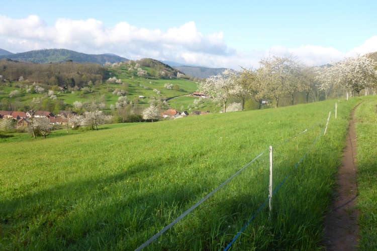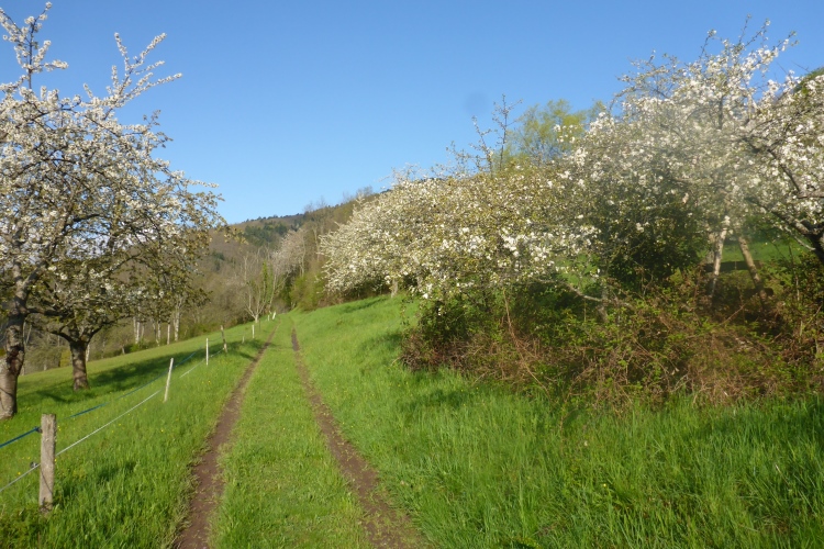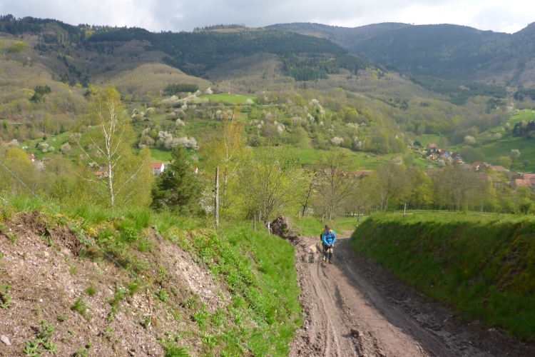 Während andere Vogesentrails mit Burgruinen oder aussichtsreichen Berggipfeln trumpfen, sind es auf dieser Strecke besonders die vielen Wiesen mit blühenden Obstbäumen, die mir gefallen. Ein weiterer Grund, warum ich diese Strecke so mag, ist die viele Abwechslung. Sowohl die Art des Trails, die Bodenbeschaffenheit als auch die Vegetation um mich herum wechseln oft. Es wird nie langweilig. Auf eine kurze Schlammrutsche folgt ein bequemer Forstweg, gleich darauf ein Wurzeltrail, ein geschotterter Feldweg, weglos über eine Wiese, durch tiefes Laub oder auch mal einfach nur weicher Waldboden, mal durch sonnigen Laubwald, dann urwüchsiger Mischwald, dann wieder blühende Obstbäume - was will man mehr?