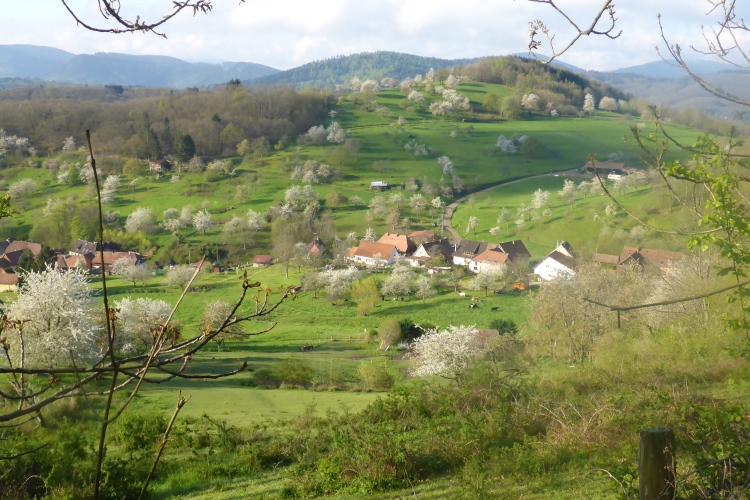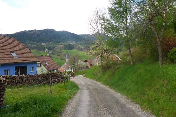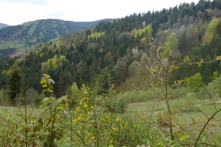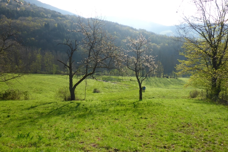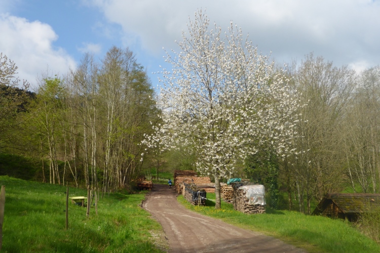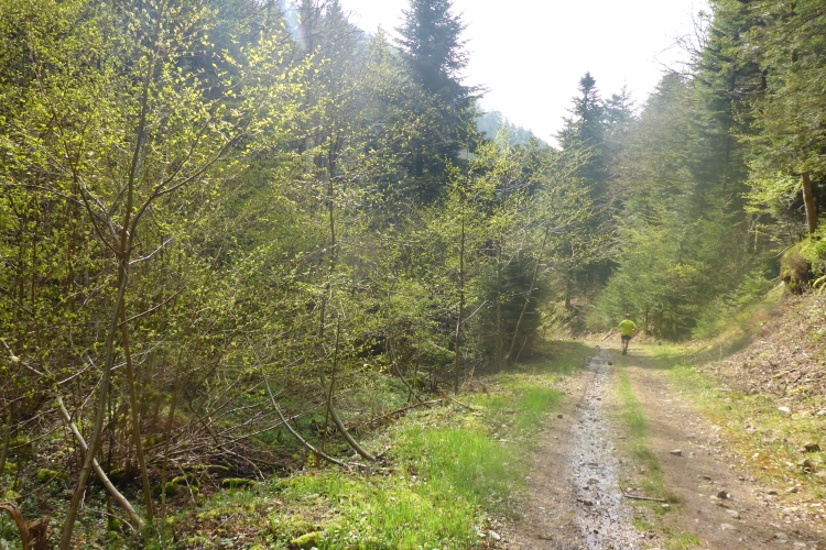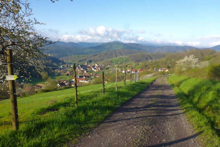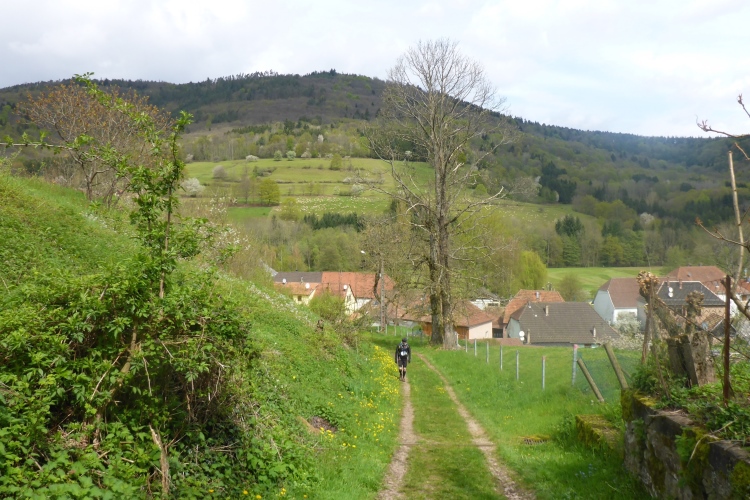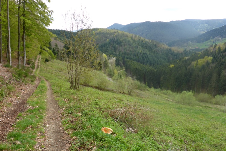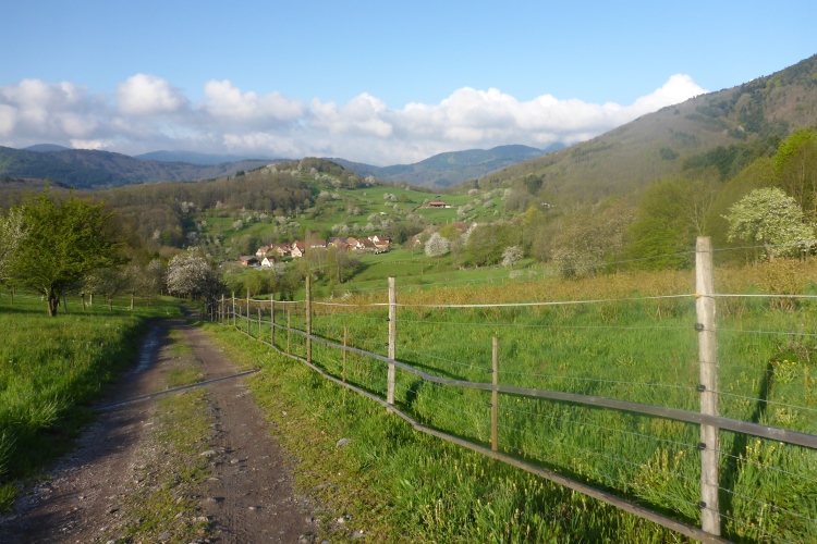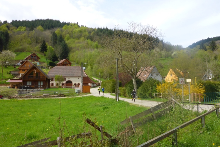 Während andere Vogesentrails mit Burgruinen oder aussichtsreichen Berggipfeln trumpfen, sind es auf dieser Strecke besonders die vielen Wiesen mit blühenden Obstbäumen, die mir gefallen. Ein weiterer Grund, warum ich diese Strecke so mag, ist die viele Abwechslung. Sowohl die Art des Trails, die Bodenbeschaffenheit als auch die Vegetation um mich herum wechseln oft. Es wird nie langweilig. Auf eine kurze Schlammrutsche folgt ein bequemer Forstweg, gleich darauf ein Wurzeltrail, ein geschotterter Feldweg, weglos über eine Wiese, durch tiefes Laub oder auch mal einfach nur weicher Waldboden, mal durch sonnigen Laubwald, dann urwüchsiger Mischwald, dann wieder blühende Obstbäume - was will man mehr?