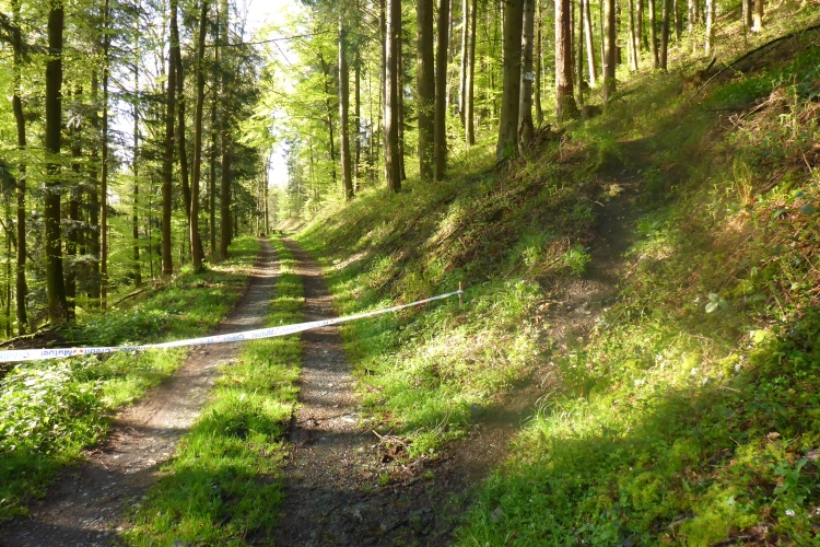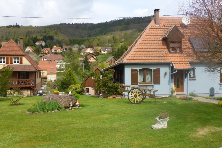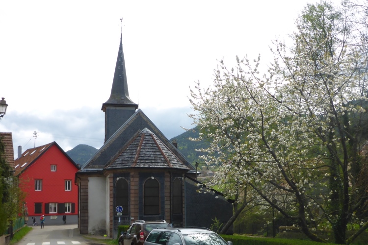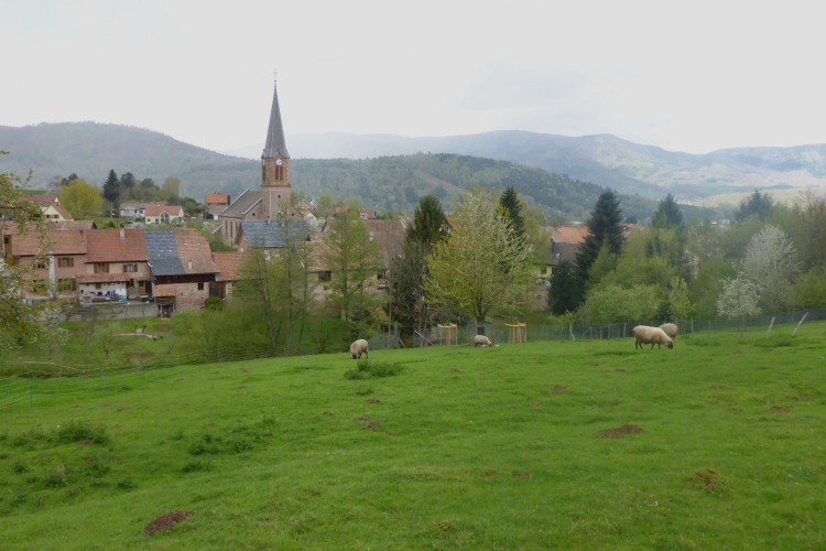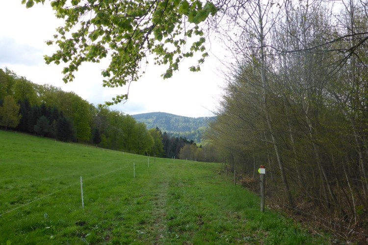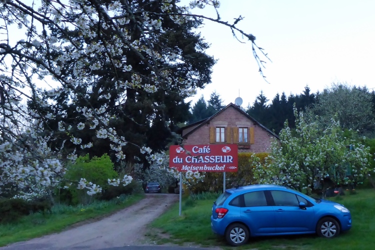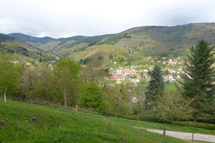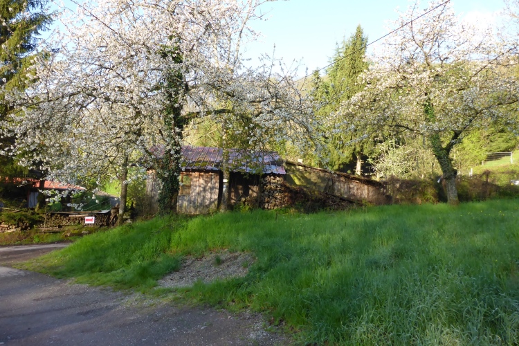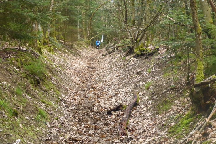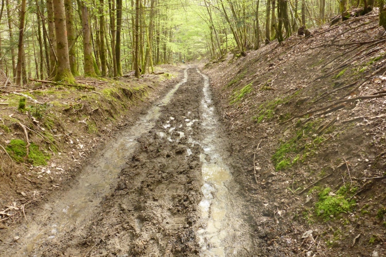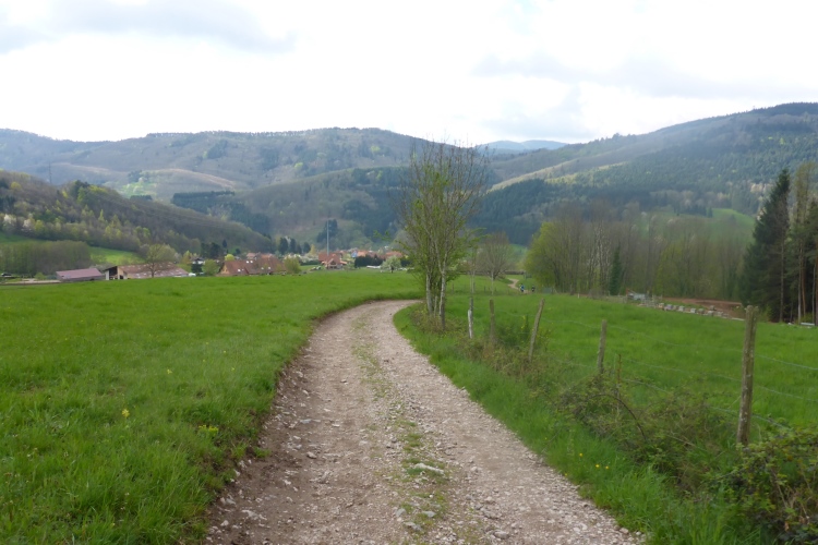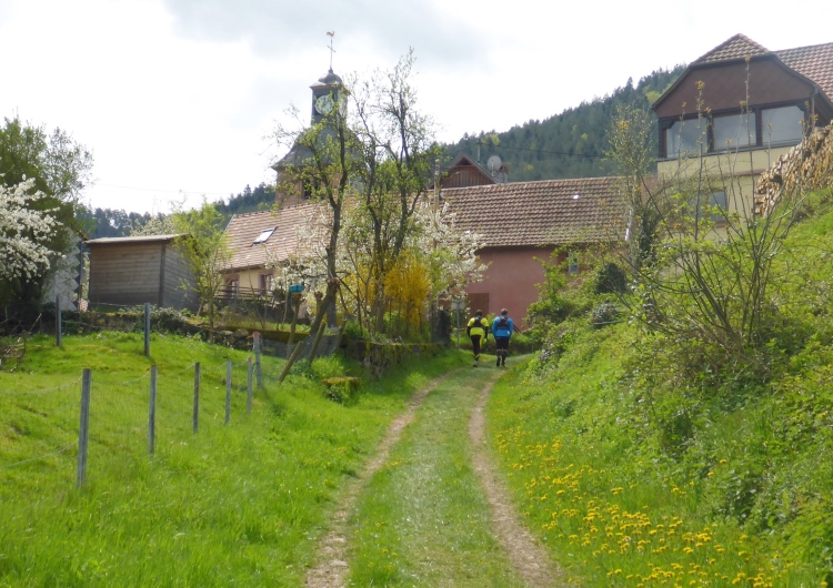 Während andere Vogesentrails mit Burgruinen oder aussichtsreichen Berggipfeln trumpfen, sind es auf dieser Strecke besonders die vielen Wiesen mit blühenden Obstbäumen, die mir gefallen. Ein weiterer Grund, warum ich diese Strecke so mag, ist die viele Abwechslung. Sowohl die Art des Trails, die Bodenbeschaffenheit als auch die Vegetation um mich herum wechseln oft. Es wird nie langweilig. Auf eine kurze Schlammrutsche folgt ein bequemer Forstweg, gleich darauf ein Wurzeltrail, ein geschotterter Feldweg, weglos über eine Wiese, durch tiefes Laub oder auch mal einfach nur weicher Waldboden, mal durch sonnigen Laubwald, dann urwüchsiger Mischwald, dann wieder blühende Obstbäume - was will man mehr?