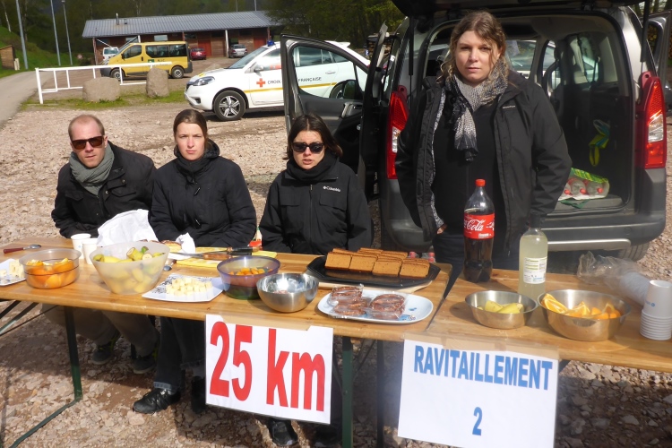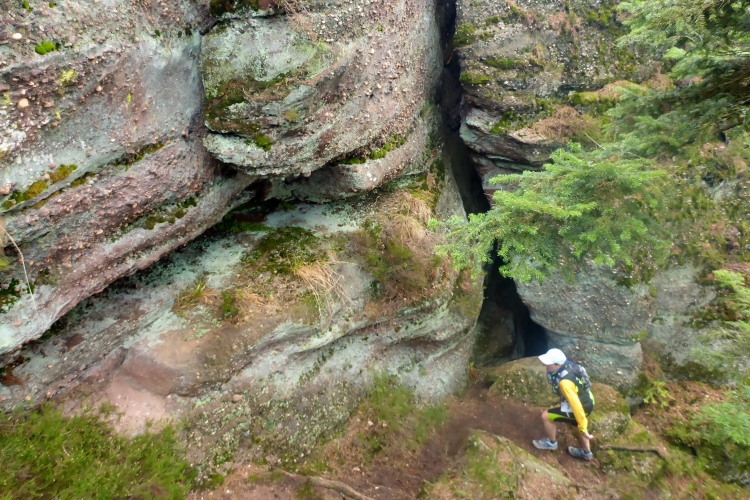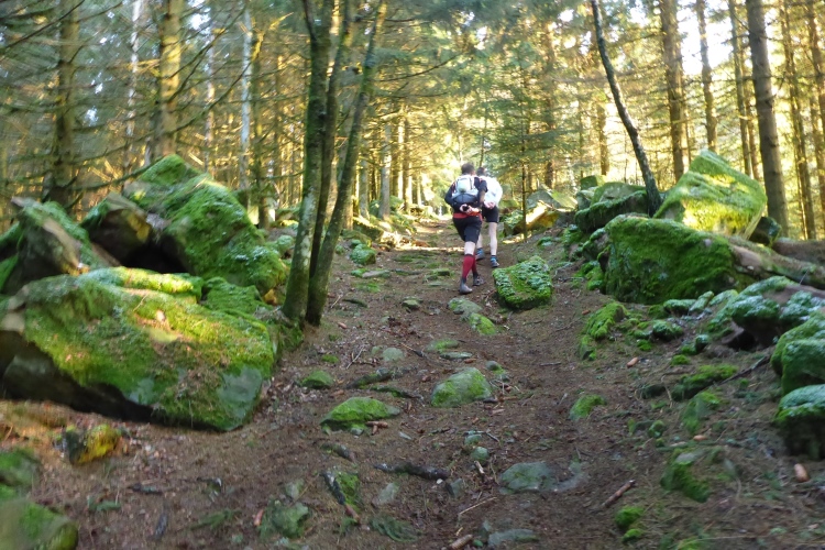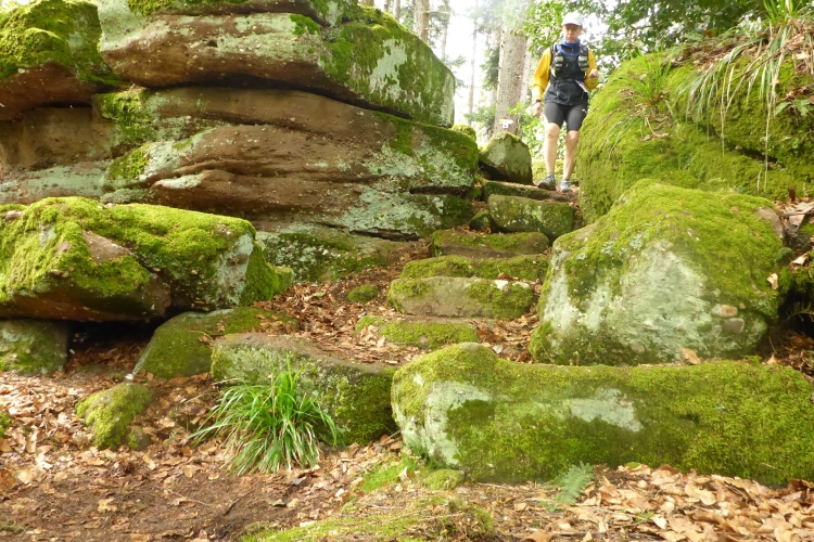 Noch eine Weile laufe ich auf Genusstrails, dann höre ich schon von weitem die Leute am Streckenposten bei den Roche des Fées (754 m), die lautstark jeden Läufer, der vorbei kommt anfeuern. Hier ist richtig Partystimmung! An dieser Stelle wird auch der Transponder gemessen, um zu verhindern, dass Läufer unterwegs abkürzen.