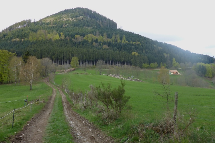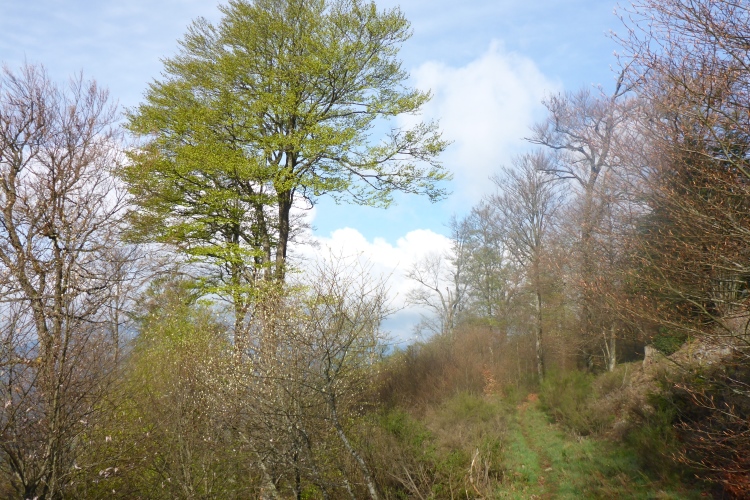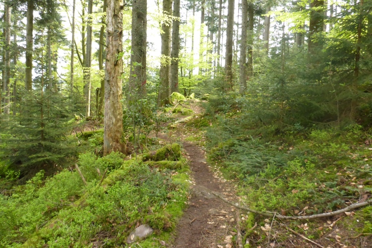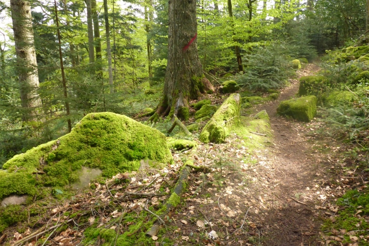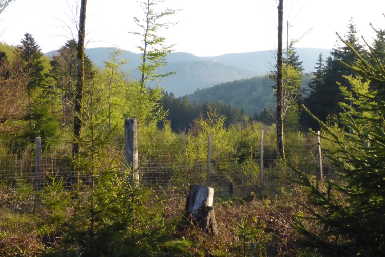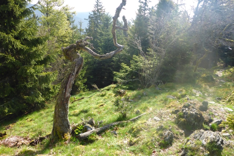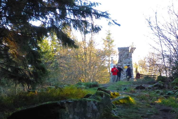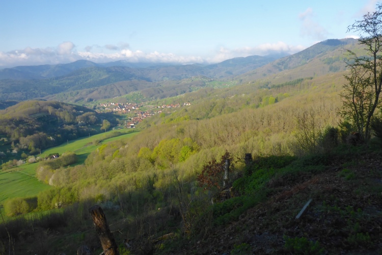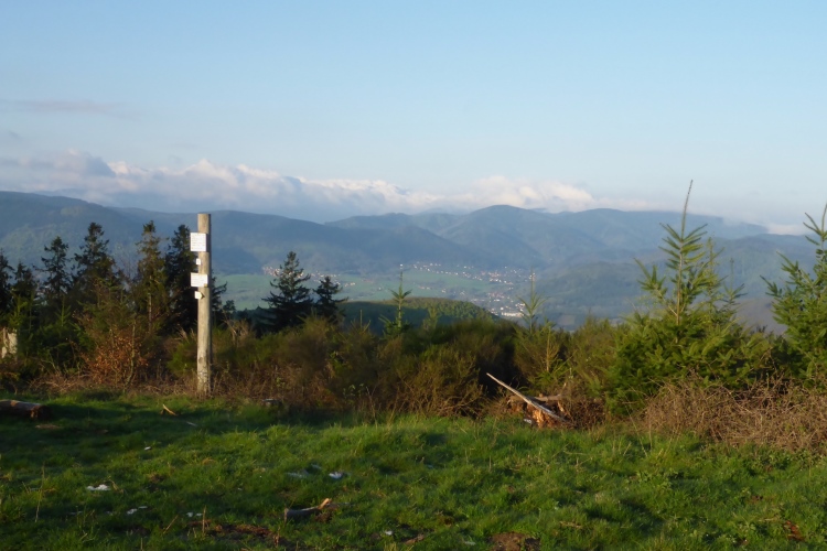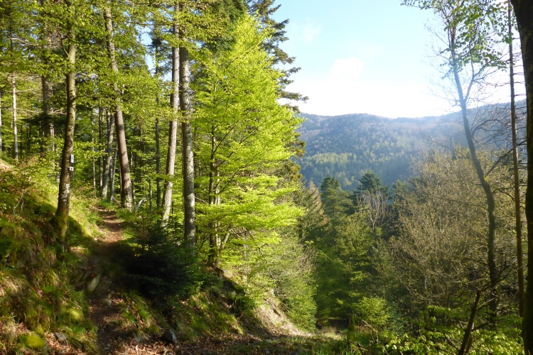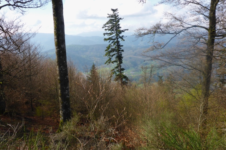 Zwischen den Bäumen hindurch kann ich nun zur Rheinebene hinab blicken, aber unten verhüllt starker Dunst die Fernsicht. Die Berge des Schwarzwalds auf der gegenüberliegenden Seite bleiben heute verborgen. Dafür gefallen mir die Vogesenberge um mich herum umso besser. Der Aufstieg endet bei einem kleinen Aussichtstürmchen auf 901 m, dessen Besteigung ich mir erspare.