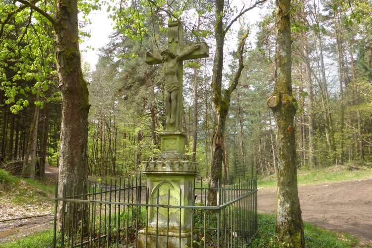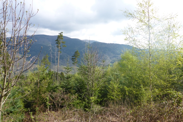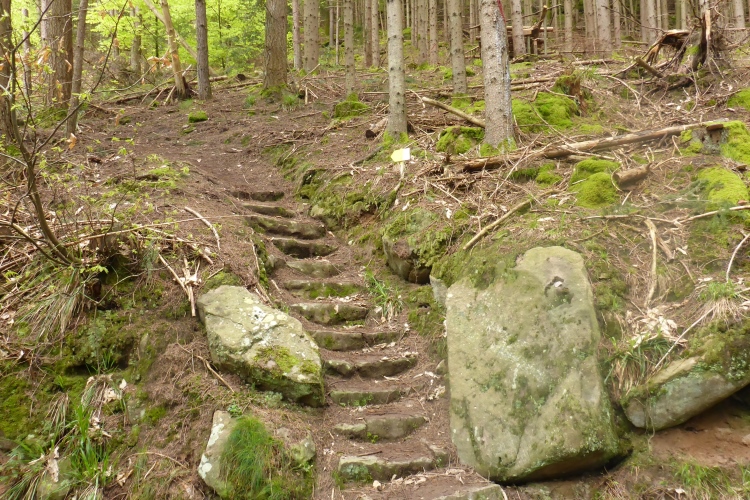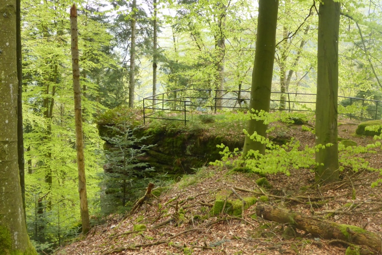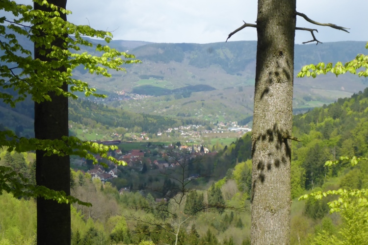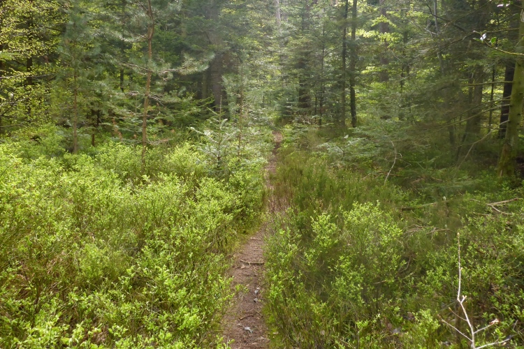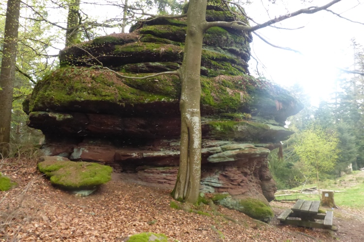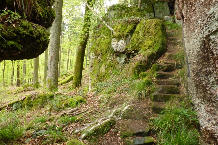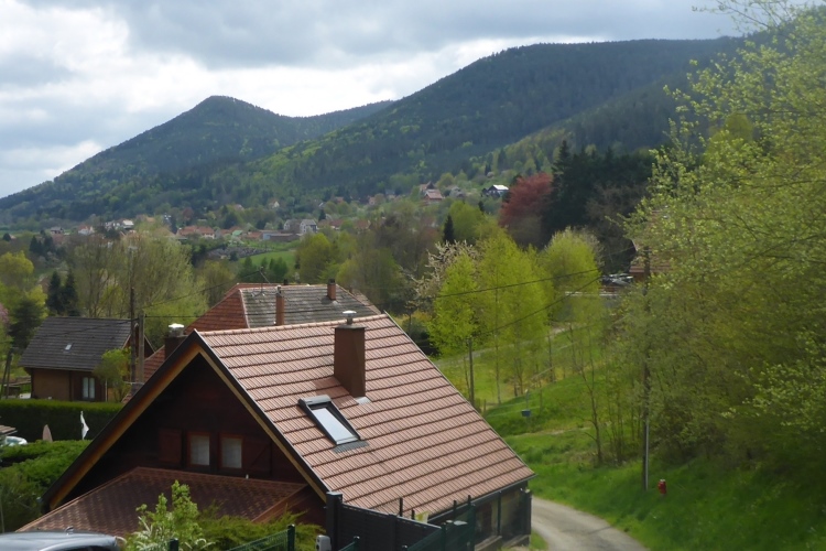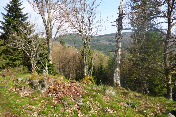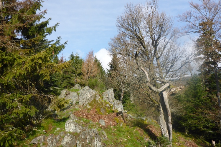 Zwischen den Bäumen hindurch kann ich nun zur Rheinebene hinab blicken, aber unten verhüllt starker Dunst die Fernsicht. Die Berge des Schwarzwalds auf der gegenüberliegenden Seite bleiben heute verborgen. Dafür gefallen mir die Vogesenberge um mich herum umso besser. Der Aufstieg endet bei einem kleinen Aussichtstürmchen auf 901 m, dessen Besteigung ich mir erspare.