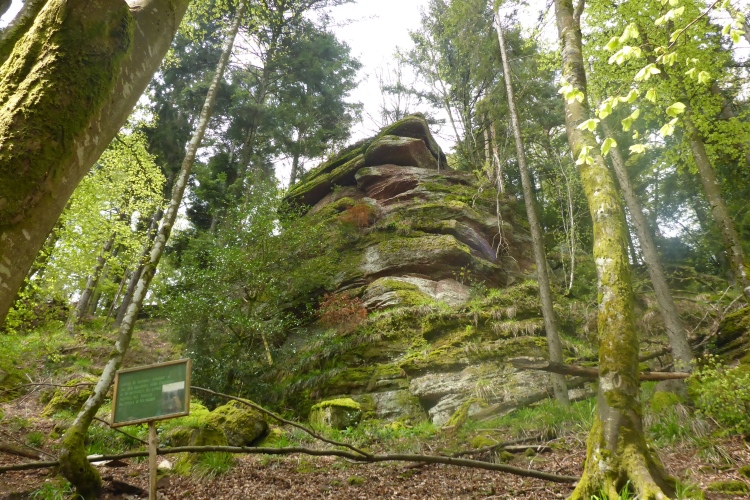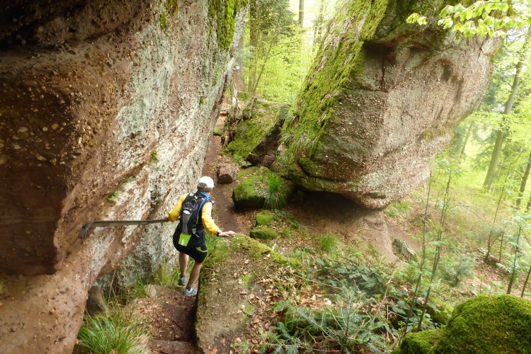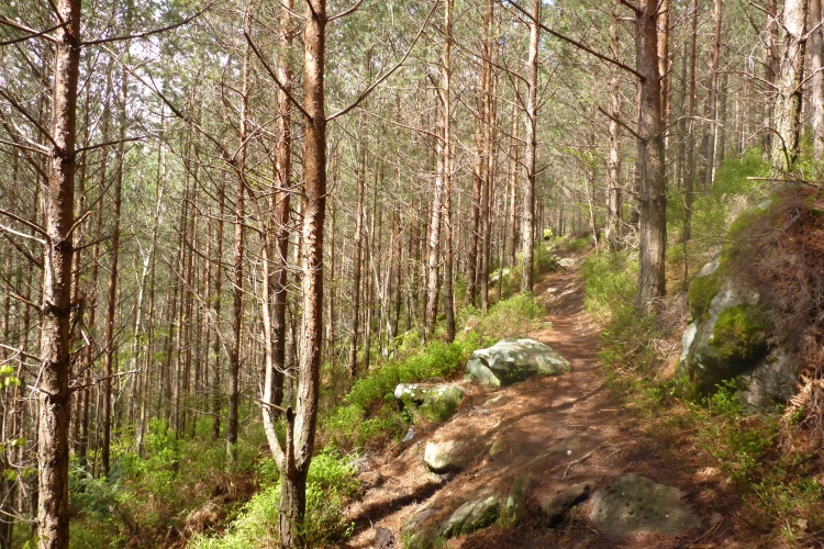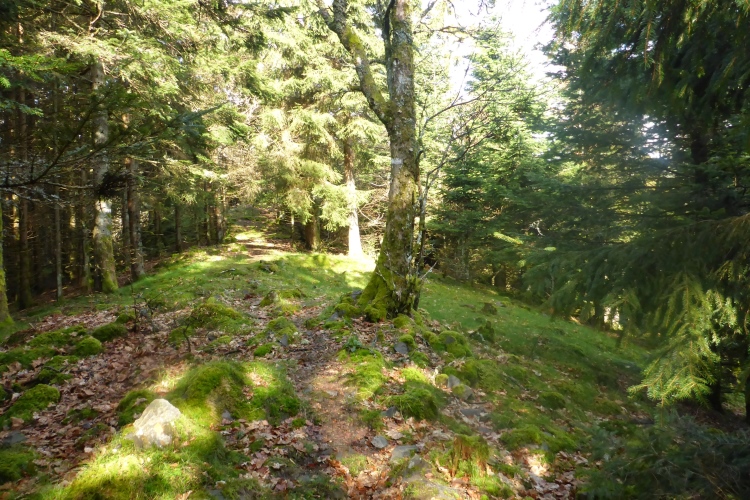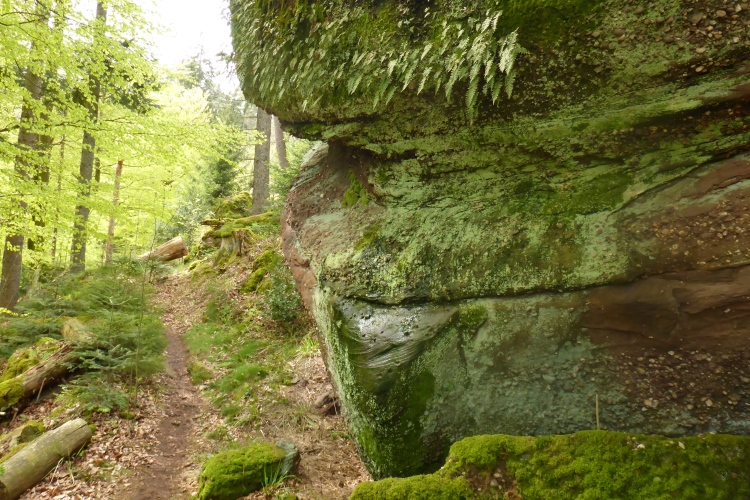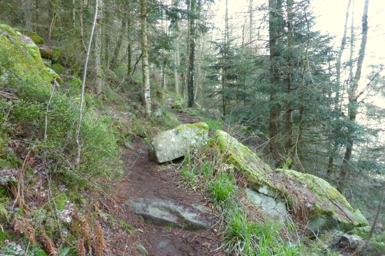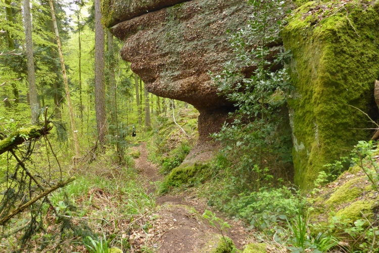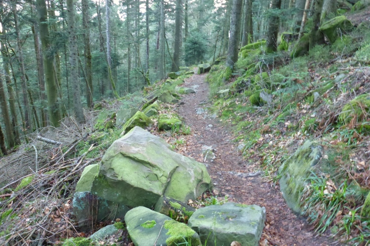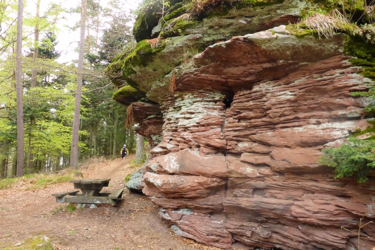 Ab dem 611 m hohen Col Du Rougerain folgt ein wunderschöner Trail mit nur wenig Steigung oder Gefälle. Ich komme vorbei am schönen Roche du Cheval Tombe sowie an weiteren interessanten Felsgruppen aus einem Konglomerat, das ich in dieser Art bisher nur sehr selten gesehen habe.