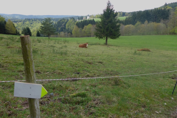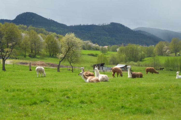 Kurz vor Ville komme ich an einer Koppel mit Lamas vorbei. Schnell in den Ort hinab, dann nur noch kurz bergauf. Unmittelbar vor dem Ziel erreiche ich den Friedhof, dann nach rechts und nach 8:28 (eine halbe Stunde vor Zielschluss) über die Ziellinie. Zufrieden kann ich Obst und Honigkuchen essen und Cola trinken.