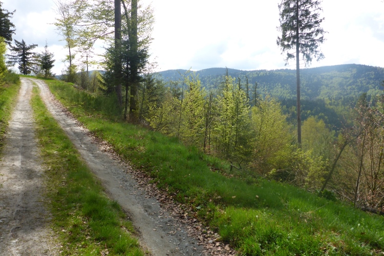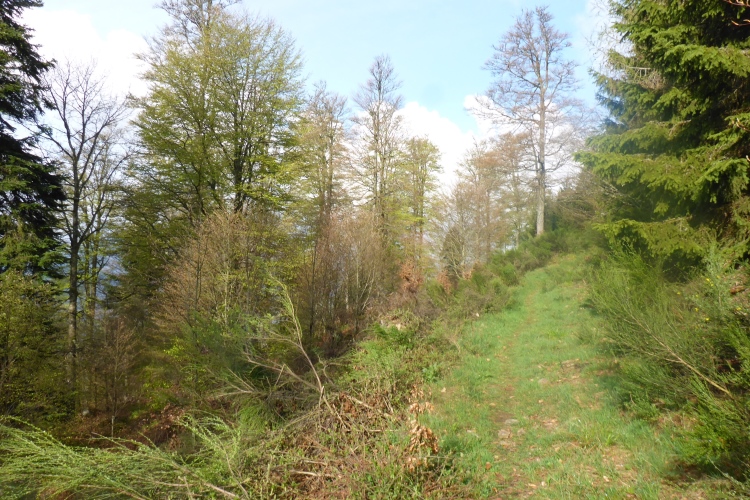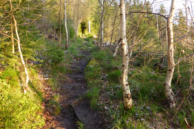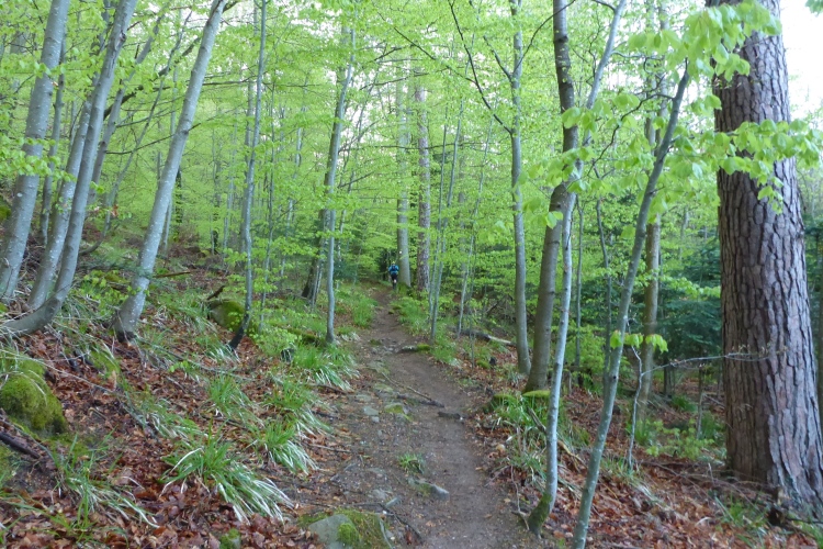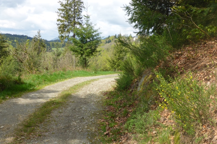 Im Wald scheint der Weg sogar noch steiler zu werden, aber die Plackerei bereitet mir viel Freude. Anstrengung ist übel, wenn sie sein muss, kann aber viel Freude bereiten, wenn man sie will. Endlich scheine ich ganz oben angekommen zu sein, doch nach kurzem Abstieg geht es doch noch einmal bergauf. Dann folgt ein langer, meist kraftsparender Abstieg, nur vereinzelt mit anspruchsvolleren Trails. Neben dem Weg blüht bereits der Ginster. Trotz der kühlen Witterung sieht man den Frühling.