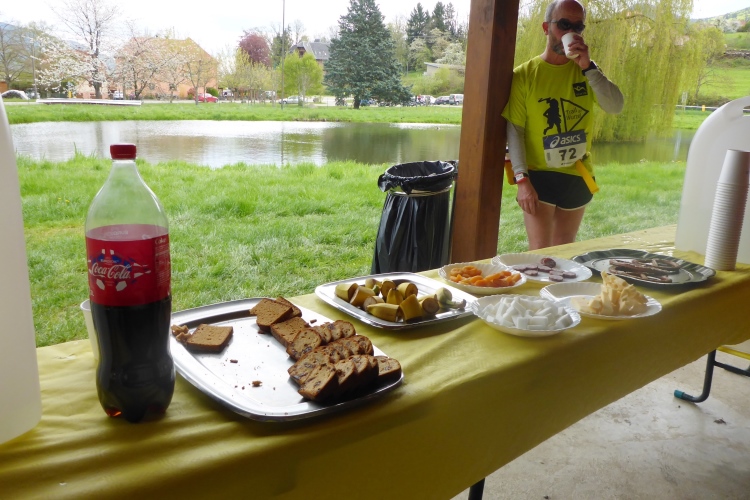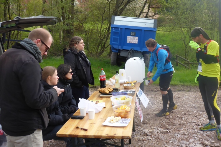 Als ich in Steige die zweite Verpflegungsstelle erreiche, habe ich 30 Minuten Vorsprung vor dem Zeitlimit. Ich esse Bananen, Orangen, Aprikosen, Wurst, Käse, Salz, Kuchen und Brezeln, trinke Cola und fülle Wasser in meine Flasche. In dieses füge ich einen Schuss Zitronensirup, der hier bereit steht, eine sehr leckere Entscheidung. Für nur 20 Euro Startgebühr wird man hier wirklich gut versorgt.