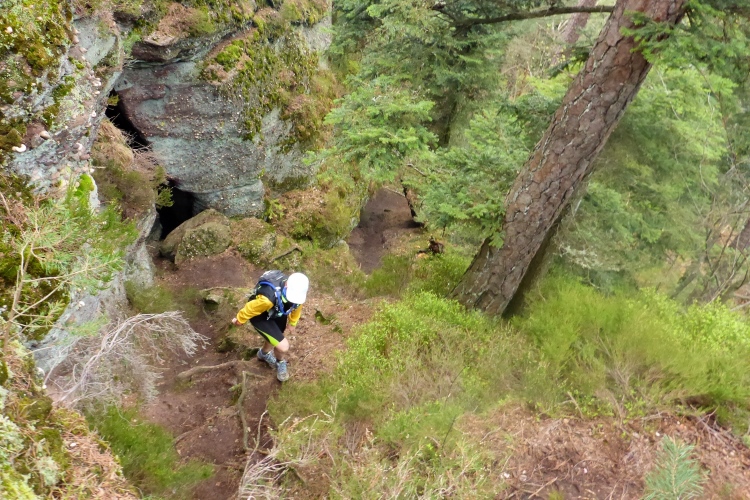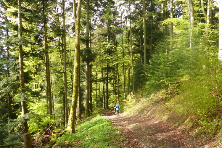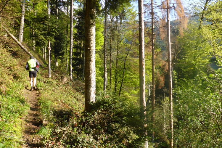 Nun beginnt ein fantastischer Trail bergab. Hier kann ich in hohem Tempo laufen, muss mich aber auf dem steinigen Boden mit vielen Wurzeln sehr konzentrieren. Solche Trails liebe ich am meisten. Mal auf der Schattenseite des Berges, mal im Sonnenschein, renne ich begeistert hinab zum Col de l´Ungersberg, dann hinauf zum Col de Bellevue. Bei dem herrlichen Wetter kann ich die Aussicht trotzdem sehr genießen. Es folgen 330 Hm Abstieg auf einer Strecke, die meist ideal zum Vollgaslaufen ist. Das kann ich jetzt auch brauchen, denn das Zeitlimit um 8.30 Uhr bei Breitenbach naht. Doch dann sehe ich Breitenbach nicht allzu weit vor mir liegen und bin sicher, dass ich problemlos rechtzeitig an der Verpflegungsstelle ankomme.