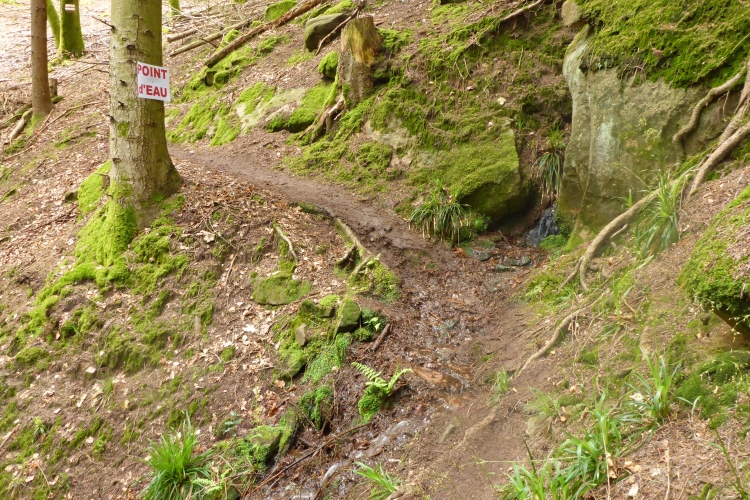 Wieder geht es kurz sehr steil bergauf, dann wird die Route gemächlicher. Etwas später warnt ein Schild vor einem steilen, etwas rutschigen Abstiegspfad, der aber kein Problem ist. Da bin ich ganz andere Sachen gewohnt. Dann marschiere ich wieder etwa 300 Höhenmeter auf Trails bergauf. Unterwegs weist ein Schild darauf hin, dass wir an einer Quelle, die aus einem Fels heraus fliest, unsere Flaschen auffüllen können.