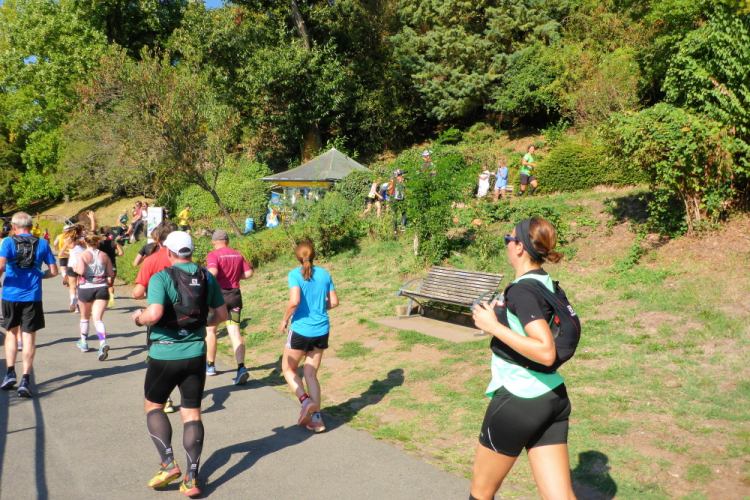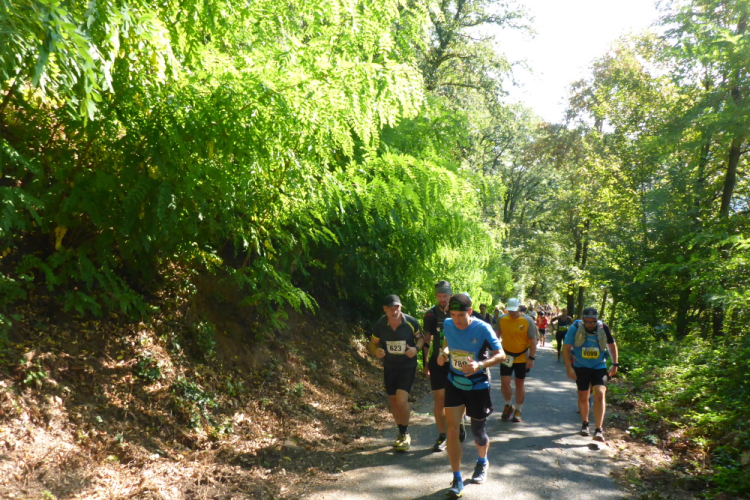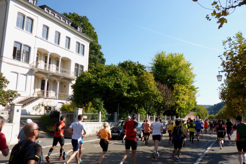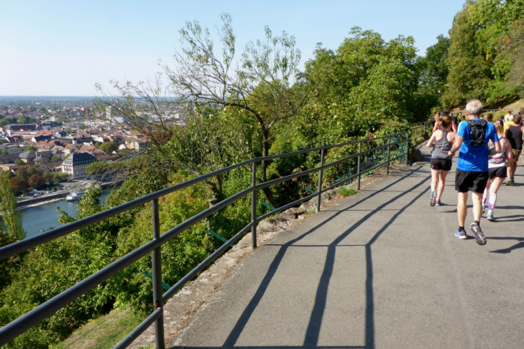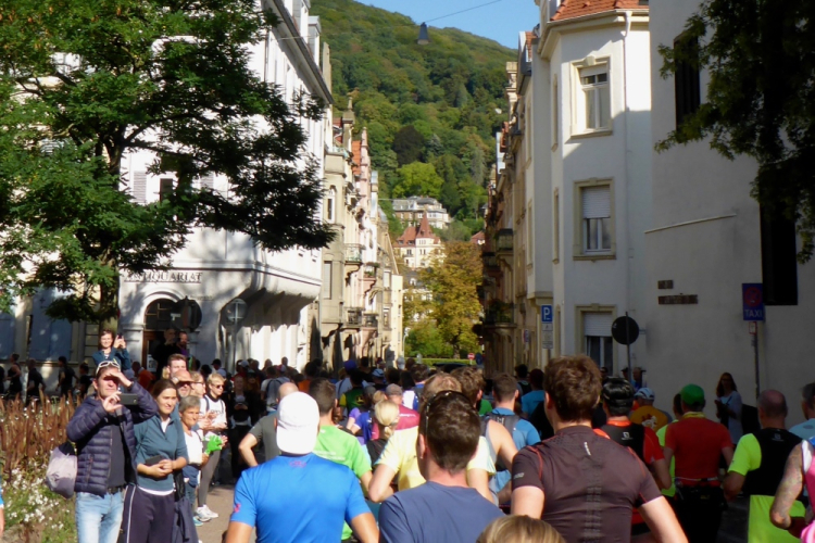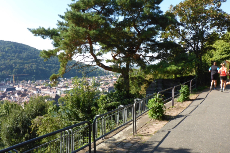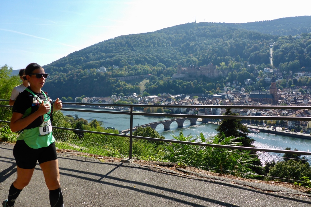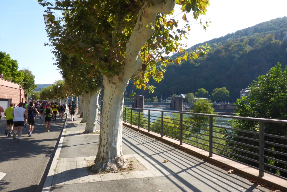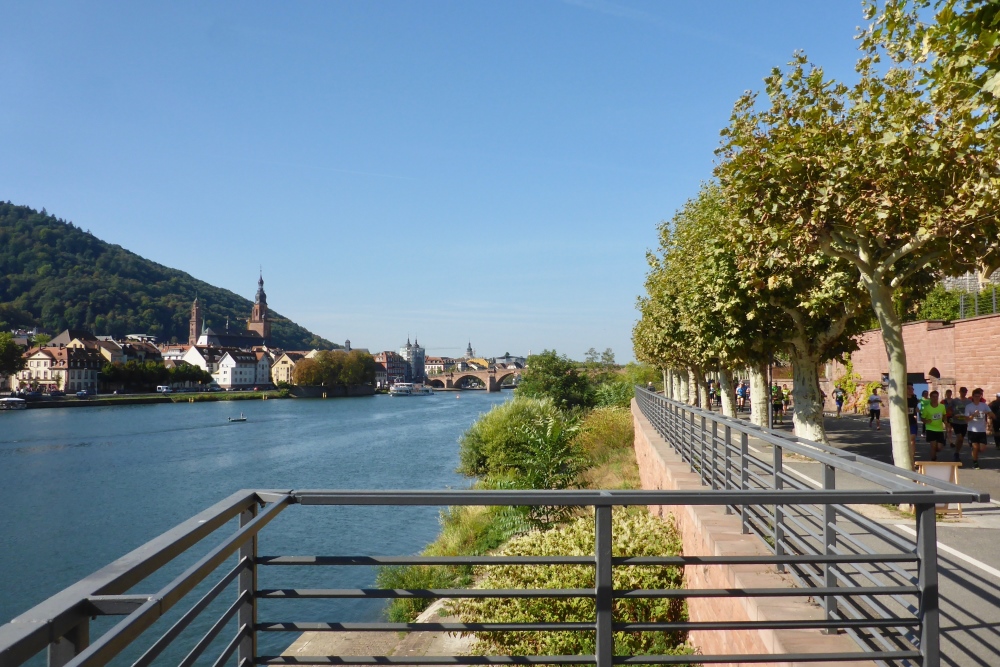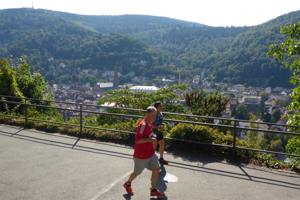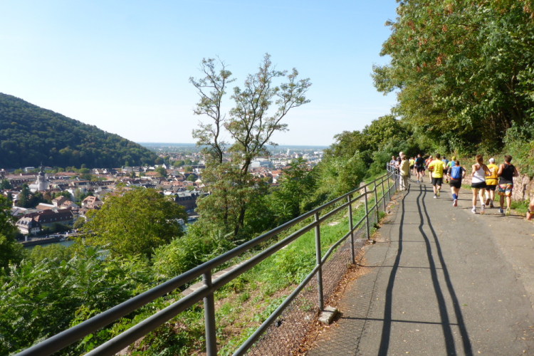 Wir laufen ein Stück am Neckar entlang, mit Blick hinüber zum Schloss und zur Altstadt, dann geht es steil bergauf. Im hinteren Teil des Läuferfeldes ist nun Wandern angesagt. Doch bald sind wir oben am Philosophenweg und können wieder richtig Gas geben, zumal es sogar noch einmal etwas bergab geht.