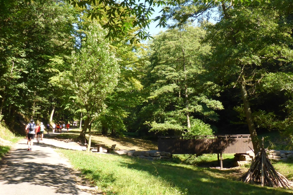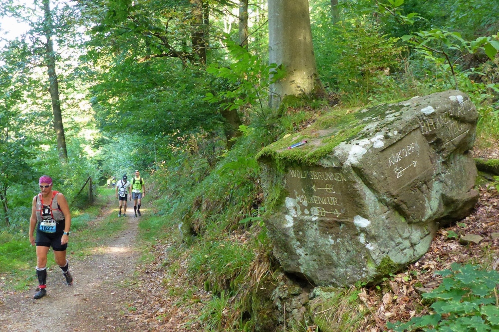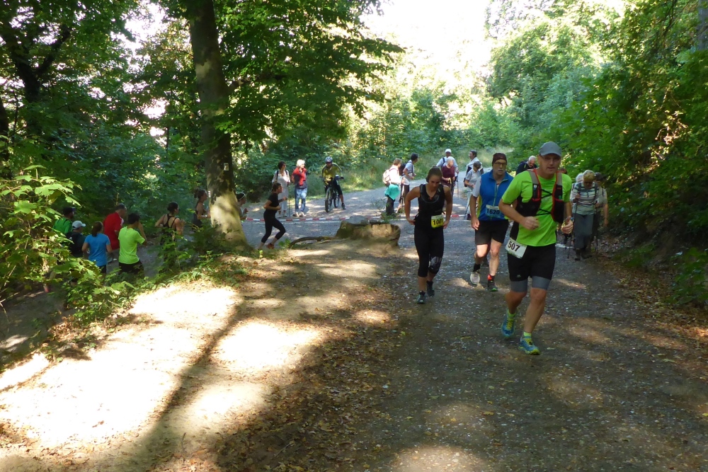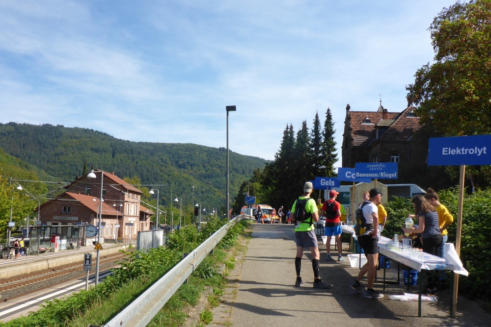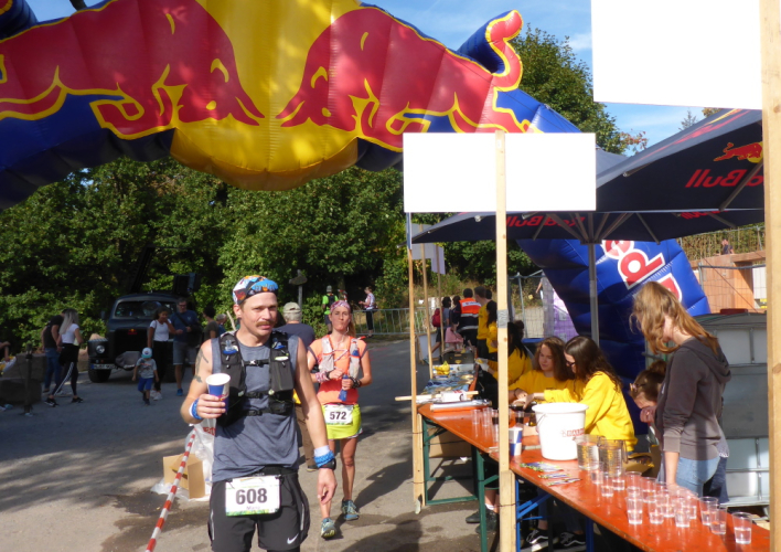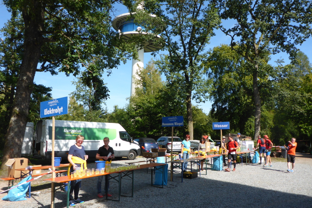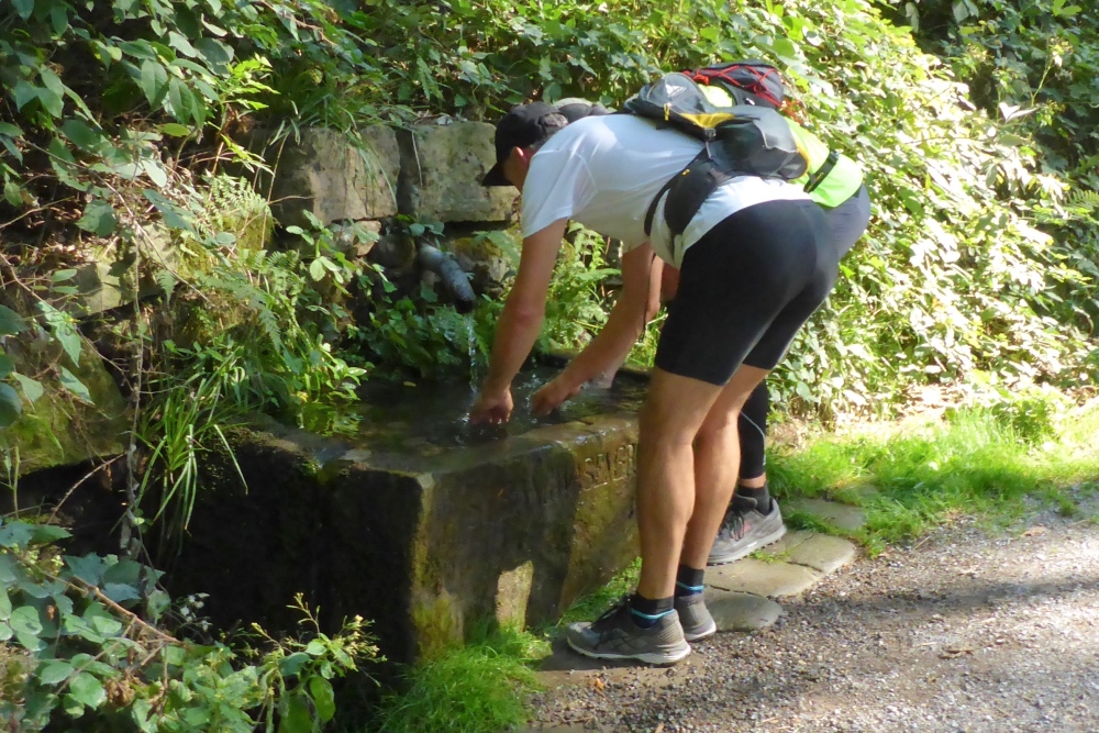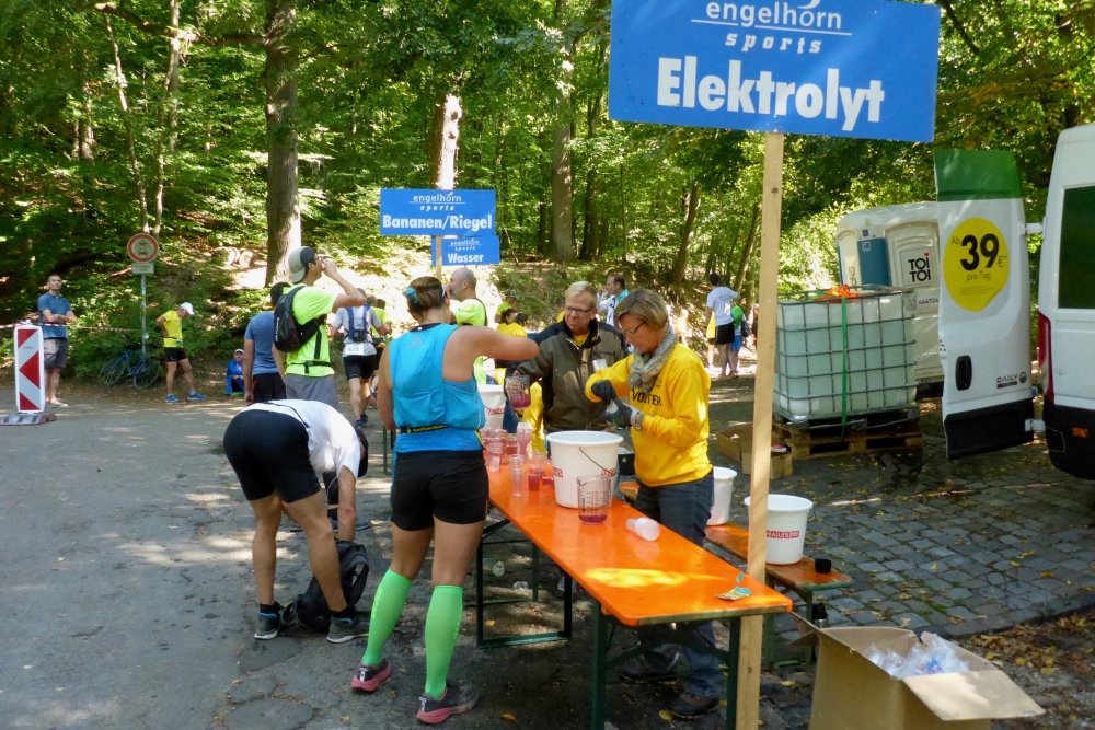 Nach 7 km erreiche ich die erste Verpflegungsstelle. Bananen, Gel, Riegel, Iso und Wasser - hier muss man nicht lange überlegen, was man will. Ab km 30 gibt es dann auch Cola. Alle Wegkreuzungen und Abzweigungen sind sehr gut gesichert. An der Stelle, wo die 30 km Läufer links abzweigen, passt ein Streckenposten sehr gut auf, damit alle auf ihre richtige Strecke gelangen. Nachdem der Trailmarathon in den letzten Jahren oft im Oktober bei herbstlichem Wetter stattfand, ist es heute sommerlich warm. Entsprechend froh sind viele, als wir an einem Brunnen vorbei kommen.