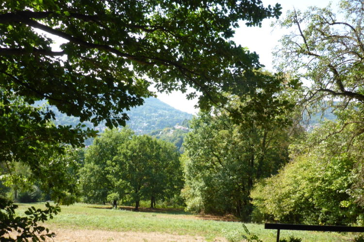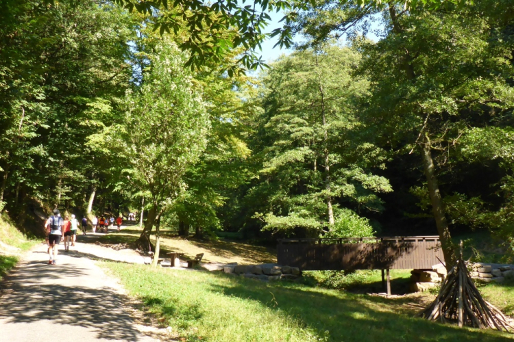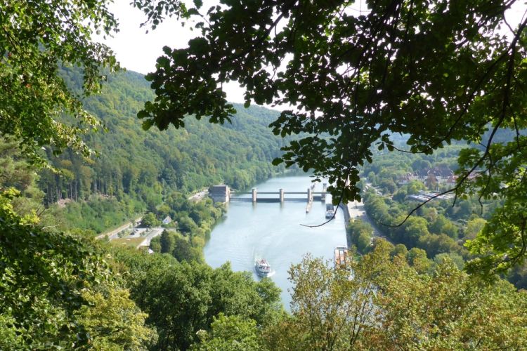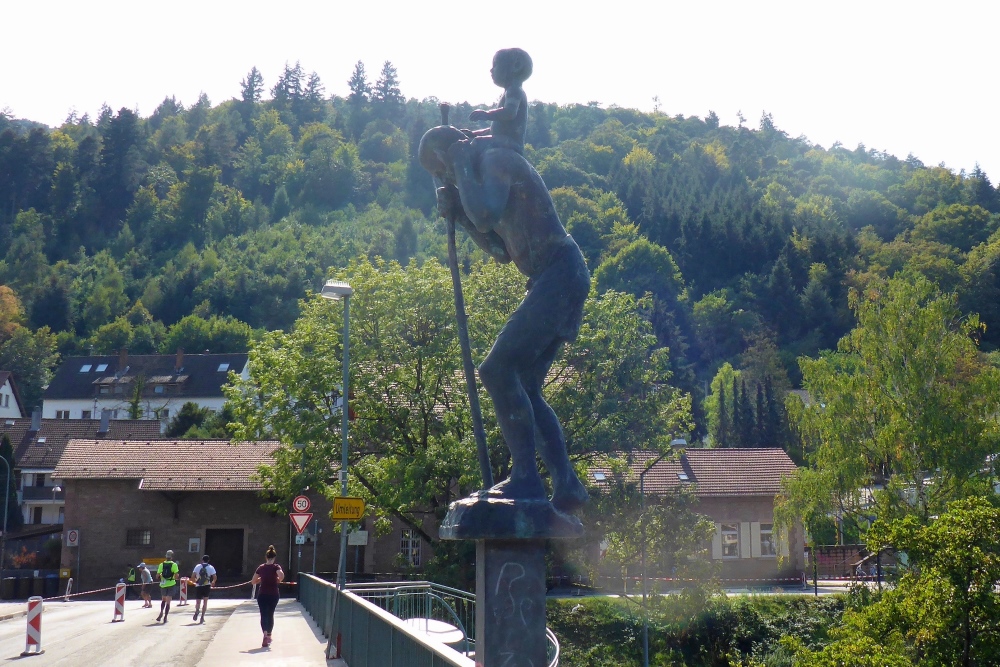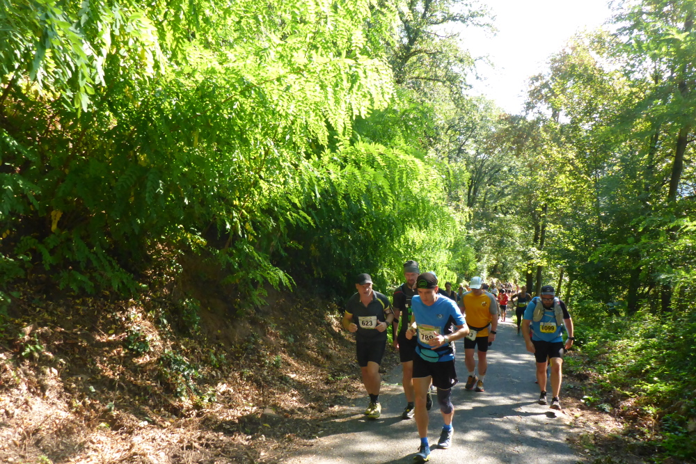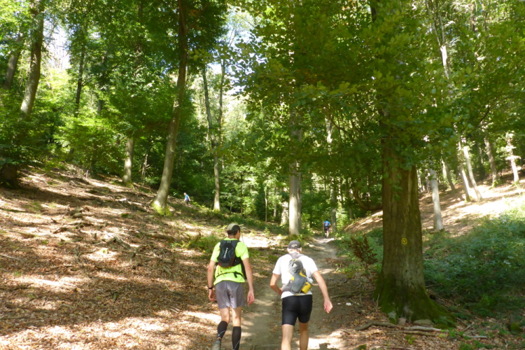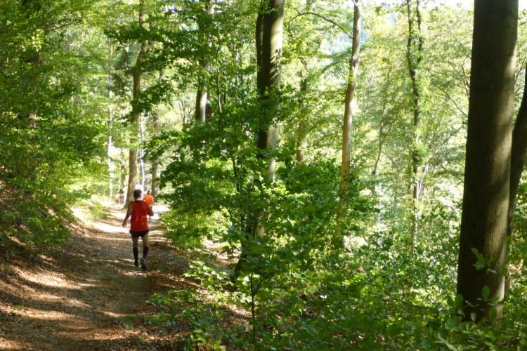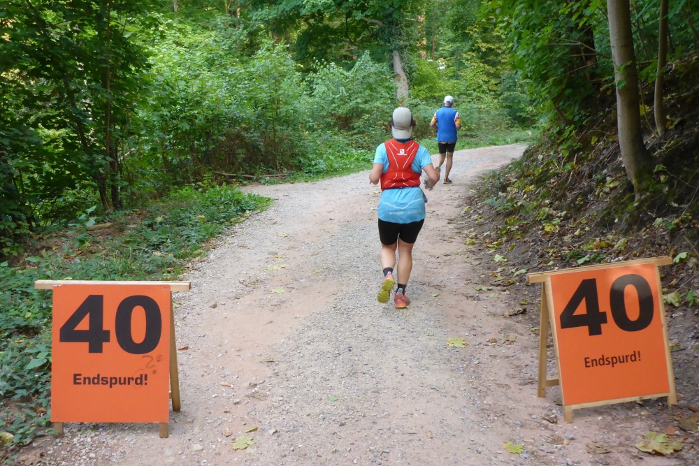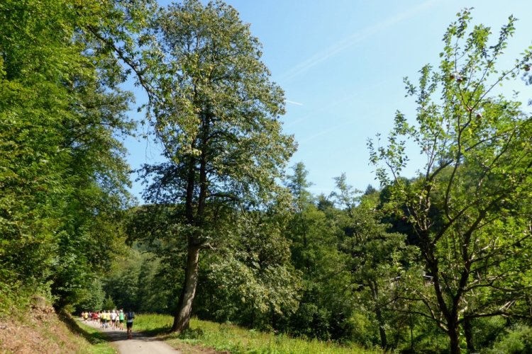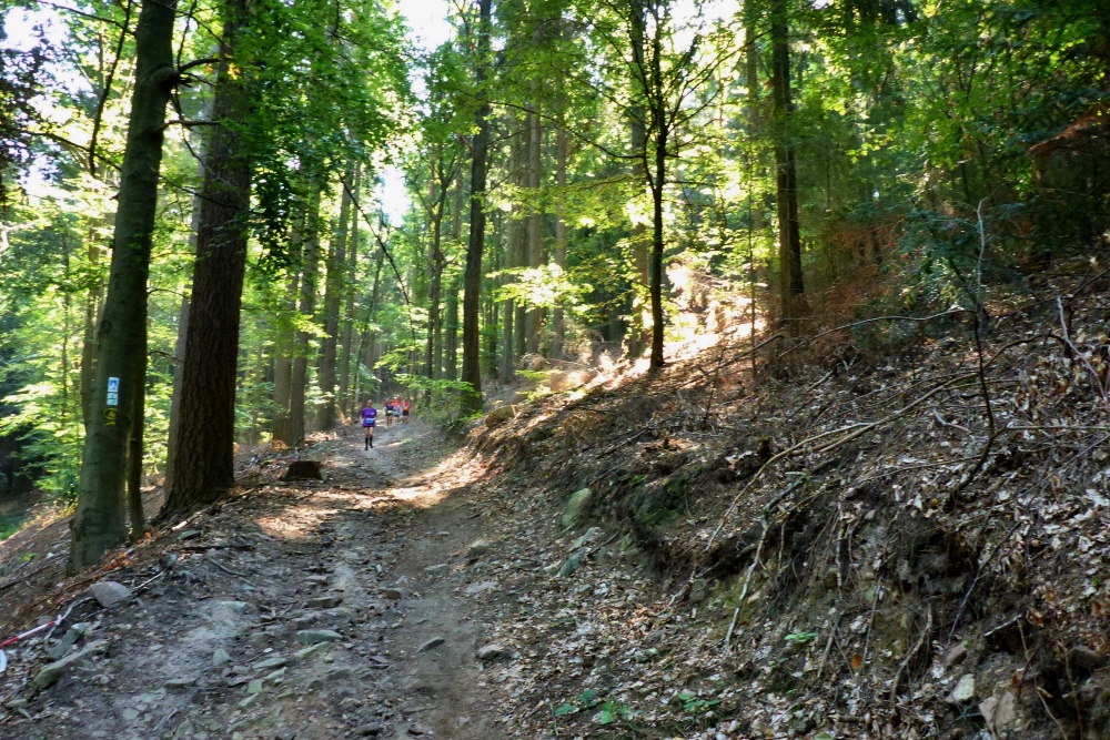 Nach dem Weißen Stein geht es viele Kilometer weit meist auf breiten Wegen mit wenig Höhenunterschieden leicht bergab oder zwischendurch auch mal wieder hinauf. Nach einem langen, nicht sehr spannenden ebenen Weg folgt ein netter Trail, der uns schnell hinab führt. Bald erreiche ich Ziegelhausen, wo man von der Brücke aus einen schönen Blick auf den Neckar hat. Wegen einer Fußverletzung konnte ich zwei Wochen nicht laufen und war mir nicht sicher, ob ich heute km 30 mit der Verpflegungsstelle vor dem Zeitlimit erreichen kann. Nun bin ich aber sogar 50 Minuten früher da und habe mehr als 2,5 Stunden Zeit für die letzten 12 Kilometer. Jetzt kann ich Tempo raus nehmen.