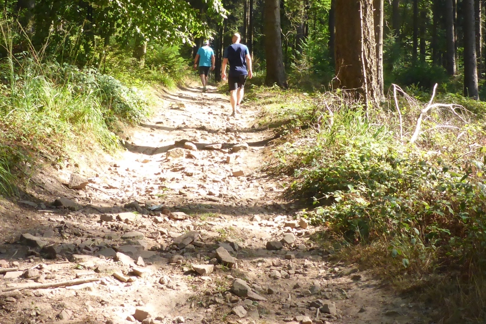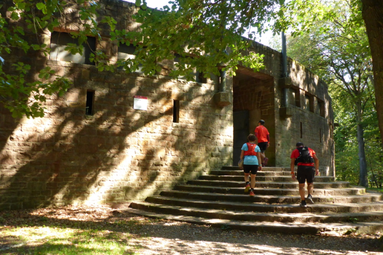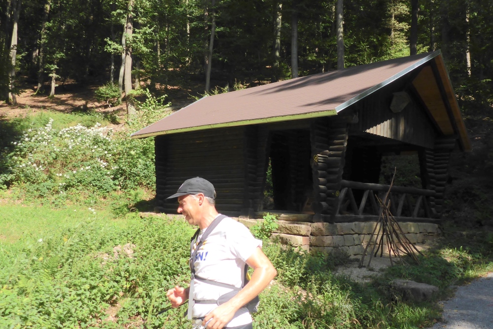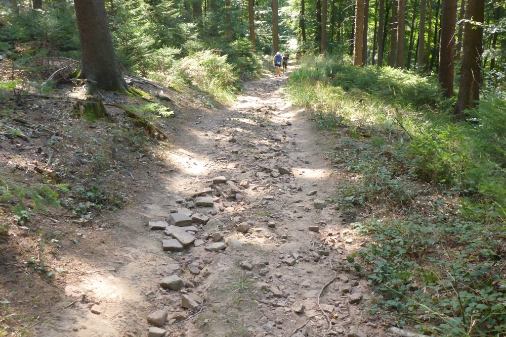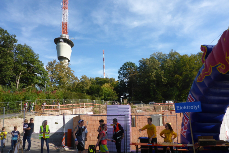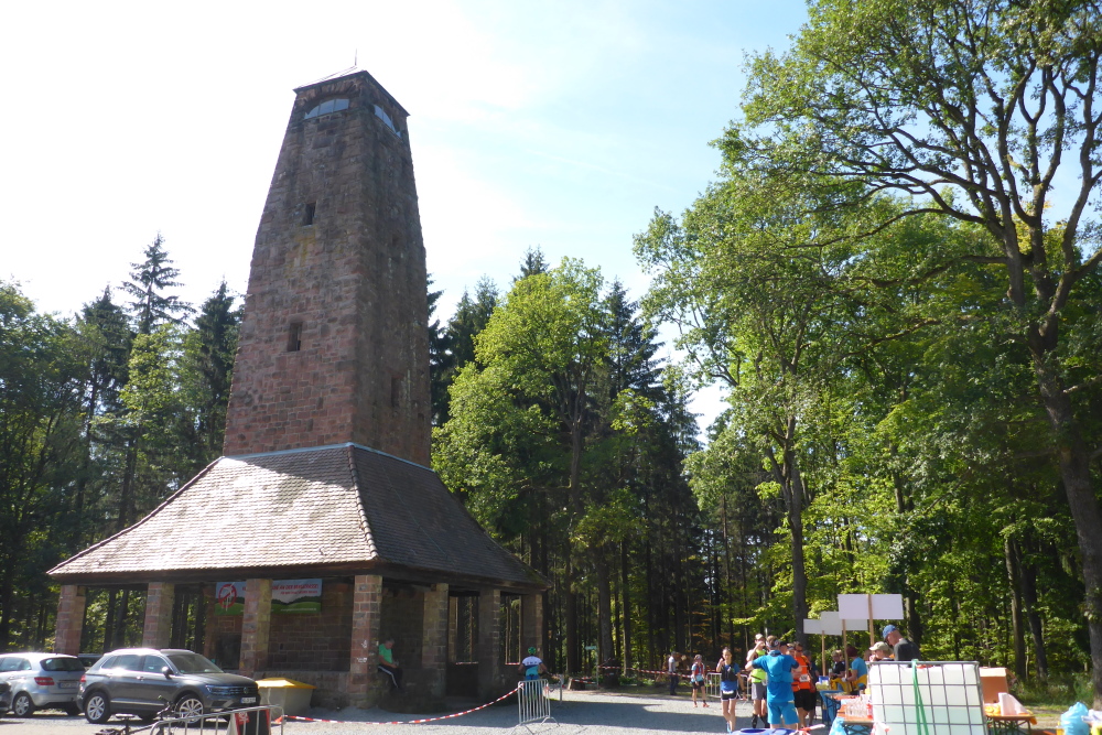 Am Weißen Stein steht ein 1906 erbauter, 23 m hoher Aussichtsturm, der inzwischen unter Denkmalschutz steht. Hier treffe ich an der Verpflegungsstelle Volker, mit dem ich letztes Jahr teilweise beim GR20 Trans-Korsika gelaufen bin. Eine Weile plaudern wir, dann muss ich weiter.
